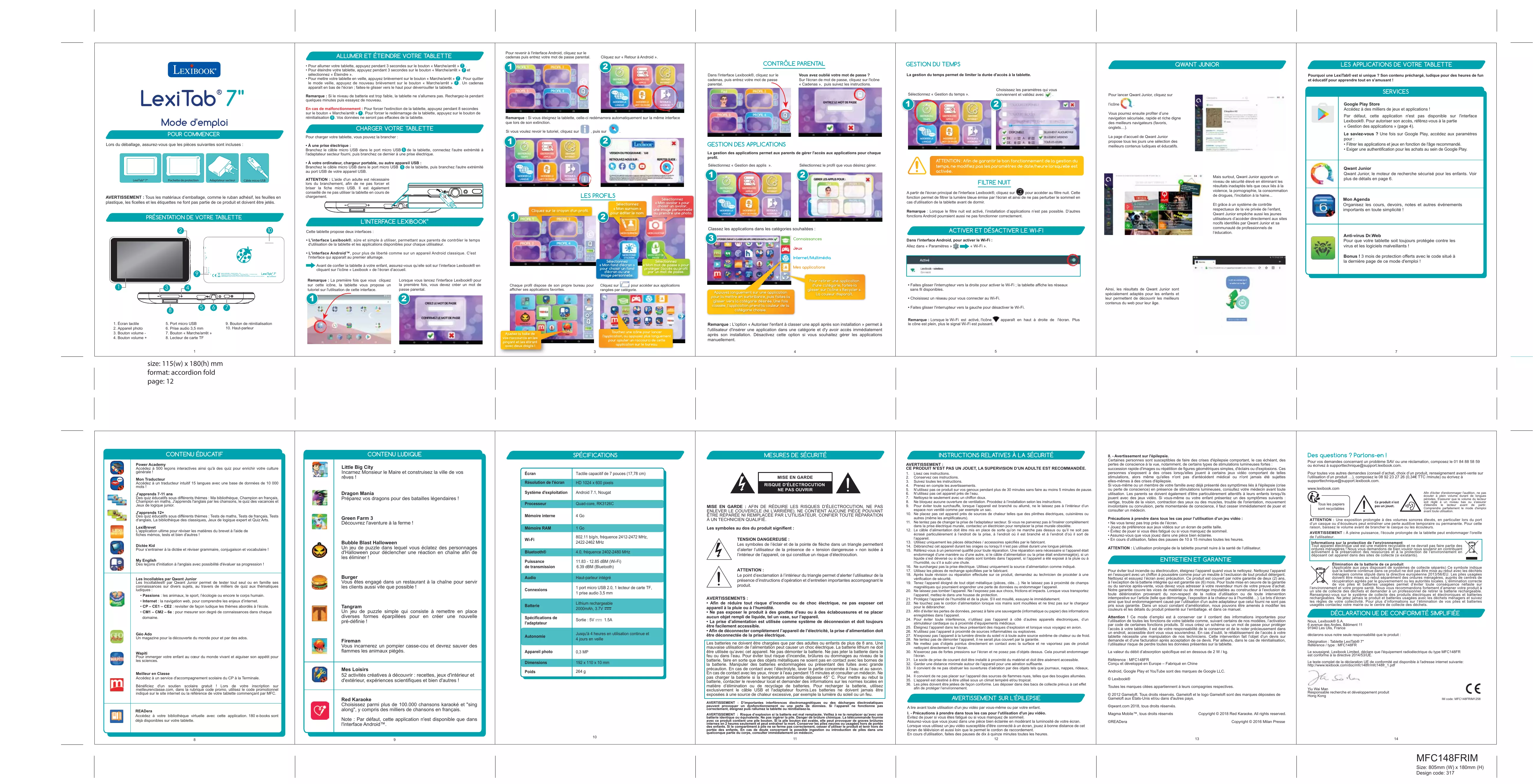 de l'utilisateur. Informations sur la protection de l’environnement Tout appareil électrique usé est une matière recyclable et ne devrait pas faire partie des ordures ménagères ! Nous vous demandons de bien vouloir nous soutenir en contribuant activement à la préservation des ressources et à la protection de l’environnement en déposant cet appareil dans des sites de collecte (si existants). Élimination de la batterie de ce produit (Applicable aux pays disposant de systèmes de collecte séparés) Ce symbole indique que la batterie contenue dans ce produit ne doit pas être mise au rebut avec les déchets ménagers comme stipulé dans la directive européenne 2013/56/EU. Les piles usagées doivent être mises au rebut séparément des ordures ménagères, auprès de centres de récupération agréés par le gouvernement ou les autorités locales. L’élimination correcte de vos piles et batteries usagées permet d’éviter toute conséquence néfaste sur l’environnement et votre propre santé. Nous vous recommandons fortement d’amener votre produit à un site de collecte des déchets et demander à un professionnel de retirer la batterie rechargeable. Renseignez-vous sur le système de collecte des produits électriques et électroniques et batteries rechargeables. Ne jetez jamais le produit et batteries usagées avec les déchets ménagers et suivez les règles de votre collectivité. Pour plus d’informations sur l’élimination de vos piles et batteries usagées contactez votre mairie ou le centre de collecte des déchets. DÉCLARATION UE DE CONFORMITÉ SIMPLIFIÉE Nous, Lexibook® S.A. 6 avenue des Andes, Bâtiment 11 91940 Les Ulis, France déclarons sous notre seule responsabilité que le produit : Désignation : Tablette LexiTab® 7'' Référence / type : MFC148FR Le soussigné, Lexibook Limited, déclare que l'équipement radioélectrique du type MFC148FR est conforme à la directive 2014/53/UE. La valeur du débit d’absorption spécifique est en dessous de 2 W / kg. Référence : MFC148FR Conçu et développé en Europe – Fabriqué en Chine Le texte complet de la déclaration UE de conformité est disponible à l'adresse internet suivante: http://www.lexibook.com/doc/mfc148fr/mfc148fr_1.pdf Android, Google Play et YouTube sont des marques de Google LLC. © Lexibook® Toutes les marques citées appartiennent à leurs compagnies respectives. © 2012 Gameloft. Tous droits réservés. Gameloft et le logo Gameloft sont des marques déposées de Gameloft aux États-Unis et/ou dans d'autres pays. Yiu Wai Man Responsable recherche et développement produit Hong Kong IM code: MFC148FRIM1258 ©qwant.com 2018, tous droits réservés. Magma Mobile™, tous droits réservés Copyright © 2018 Red Karaoke. All rights reserved. ©READera Copyright © 2016 Milan Presse