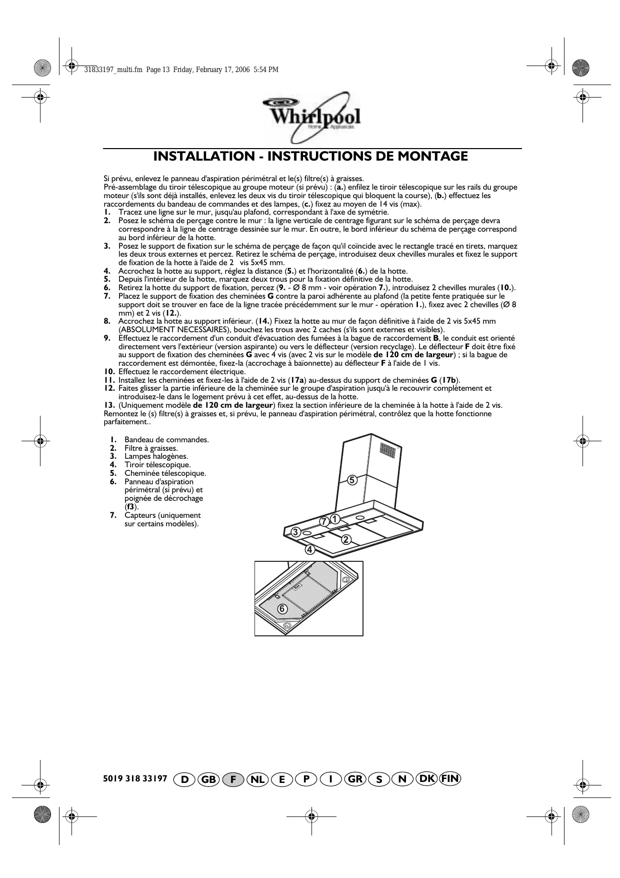 31833197_multi.fm Page 13 Friday, February 17, 2006 5:54 PM INSTALLATION - INSTRUCTIONS DE MONTAGE Si prévu, enlevez le panneau d'aspiration périmétral et le(s) filtre(s) à graisses. Pré-assemblage du tiroir télescopique au groupe moteur (si prévu) : (a.) enfilez le tiroir télescopique sur les rails du groupe moteur (s'ils sont déjà installés, enlevez les deux vis du tiroir télescopique qui bloquent la course), (b.) effectuez les raccordements du bandeau de commandes et des lampes, (c.) fixez au moyen de 14 vis (max). 1. Tracez une ligne sur le mur, jusqu'au plafond, correspondant à l'axe de symétrie. 2. Posez le schéma de perçage contre le mur : la ligne verticale de centrage figurant sur le schéma de perçage devra correspondre à la ligne de centrage dessinée sur le mur. En outre, le bord inférieur du schéma de perçage correspond au bord inférieur de la hotte. 3. Posez le support de fixation sur le schéma de perçage de façon qu'il coïncide avec le rectangle tracé en tirets, marquez les deux trous externes et percez. Retirez le schéma de perçage, introduisez deux chevilles murales et fixez le support de fixation de la hotte à l'aide de 2 vis 5x45 mm. 4. Accrochez la hotte au support, réglez la distance (5.) et l'horizontalité (6.) de la hotte. 5. Depuis l'intérieur de la hotte, marquez deux trous pour la fixation définitive de la hotte. 6. Retirez la hotte du support de fixation, percez (9. - Ø 8 mm - voir opération 7.), introduisez 2 chevilles murales (10.). 7. Placez le support de fixation des cheminées G contre la paroi adhérente au plafond (la petite fente pratiquée sur le support doit se trouver en face de la ligne tracée précédemment sur le mur - opération 1.), fixez avec 2 chevilles (Ø 8 mm) et 2 vis (12.). 8. Accrochez la hotte au support inférieur. (14.) Fixez la hotte au mur de façon définitive à l'aide de 2 vis 5x45 mm (ABSOLUMENT NECESSAIRES), bouchez les trous avec 2 caches (s'ils sont externes et visibles). 9. Effectuez le raccordement d'un conduit d'évacuation des fumées à la bague de raccordement B, le conduit est orienté directement vers l'extérieur (version aspirante) ou vers le déflecteur (version recyclage). Le déflecteur F doit être fixé au support de fixation des cheminées G avec 4 vis (avec 2 vis sur le modèle de 120 cm de largeur) ; si la bague de raccordement est démontée, fixez-la (accrochage à baïonnette) au déflecteur F à l'aide de 1 vis. 10. Effectuez le raccordement électrique. 11. Installez les cheminées et fixez-les à l'aide de 2 vis (17a) au-dessus du support de cheminées G (17b). 12. Faites glisser la partie inférieure de la cheminée sur le groupe d'aspiration jusqu'à le recouvrir complètement et introduisez-le dans le logement prévu à cet effet, au-dessus de la hotte. 13. (Uniquement modèle de 120 cm de largeur) fixez la section inférieure de la cheminée à la hotte à l'aide de 2 vis. Remontez le (s) filtre(s) à graisses et, si prévu, le panneau d'aspiration périmétral, contrôlez que la hotte fonctionne parfaitement.. 1. 2. 3. 4. 5. 6.