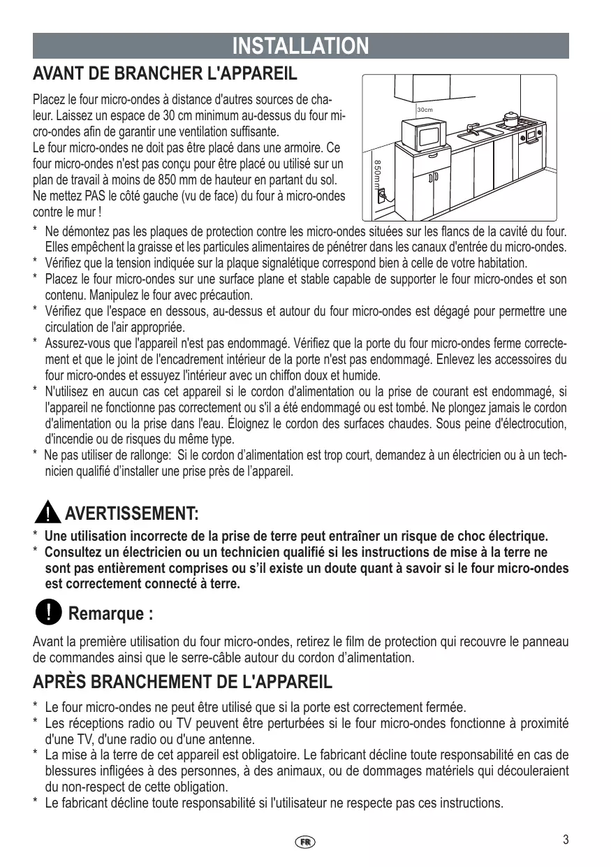 APRÈS BRANCHEMENT DE L'APPAREIL * Le four micro-ondes ne peut être utilisé que si la porte est correctement fermée. * Les réceptions radio ou TV peuvent être perturbées si le four micro-ondes fonctionne à proximité d'une TV, d'une radio ou d'une antenne. * La mise à la terre de cet appareil est obligatoire. Le fabricant décline toute responsabilité en cas de blessures infligées à des personnes, à des animaux, ou de dommages matériels qui découleraient du non-respect de cette obligation. * Le fabricant décline toute responsabilité si l'utilisateur ne respecte pas ces instructions. FR