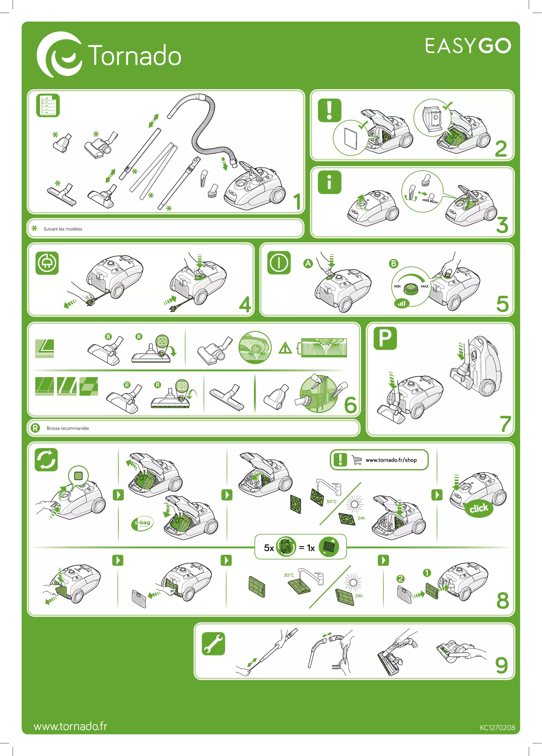 Les enfants doivent être surveillés, pour éviter qu’ils ne jouent avec cet appareil. Toujours débrancher la fi che de la prise avant toute opération de nettoyage ou d’entretien de votre aspirateur. Ne jamais utiliser l’aspirateur sans fi ltres. Attention Cet appareil comporte des connexions électriques: • Ne jamais aspirer de liquide. • Pour nettoyer l’appareil, ne le plonger dans aucun liquide. • Le flexible doit être régulièrement vérifi é et ne doit pas être utilisé s’il est endommagé. Les éléments susmentionnés peuvent provoquer de graves dommages au moteur. La garantie ne prend pas en charge ce type de dommage. Cet aspirateur est exclusivement destiné à un usage domestique. Ne jamais utiliser l’aspirateur: • À proximité de gaz infl ammables, etc. • Sur des objets pointus • Sur des cendres chaudes ou refroidies, des mégots de cigarettes incandescents, etc. • Sur des particules de poussière très fi nes issues entre autres du plâtre, du béton ou de la farine. • Les produits en bombe aérosol peuvent être inflammables. Ne pas vaporiser de tels produits à proximité ou sur l’aspirateur. Précautions d’emploi du cordon d’alimentation • Vérifi er régulièrement que la prise et le cordon ne sont pas endommagés. Ne jamais utiliser l’aspirateur si le cordon est endommagé. • Si le cordon d’alimentation est endommagé, il peut uniquement être remplacé dans un Centre Service Agréé Tornado, afi n d’éviter tout danger. Les dommages portés au cordon de l’aspirateur ne sont pas couverts par la garantie. • Ne jamais tirer ni soulever l’aspirateur par le cordon. Toutes les révisions et réparations doivent être effectuées dans un Centre Service Agréé Tornado. Ranger l’aspirateur dans un endroit sec. Informations consommateur et fi n de vie Tornado décline toute responsabilité pour les dommages résultant d’une utilisation incorrecte de l’appareil ou en cas de modifi cation de l’appareil. Pour plus d’informations sur la garantie et les points de contact consommateur, voir le livret de garantie inclus dans l’emballage. Pour nous transmettre vos commentaires sur l’aspirateur ou sur les instructions d’utilisation, envoyez un e-mail à l’adresse floorcare@tornado.com Appareil en fi n de vie Ce produit a été conçu dans un souci de respect de l’environnement. Tous les éléments en plastique sont marqués à des fi ns de recyclage. Pour plus de détails, visiter notre site Web : www.tornado.fr. Les emballages sélectionnés sont sans danger pour l’environnement et recyclables. Recyclez les matériaux portant le symbole . Déposez les emballages dans les conteneurs prévus à cet effet. Contribuez à la protection de l’environnement et à votre sécurité, recyclez vos produits électriques et électroniques. Ne jetez pas les appareils portant le symbole avec les ordures ménagères. Emmenez un tel produit dans votre centre local de recyclage ou contactez vos services municipaux. * Suivant les modèles.