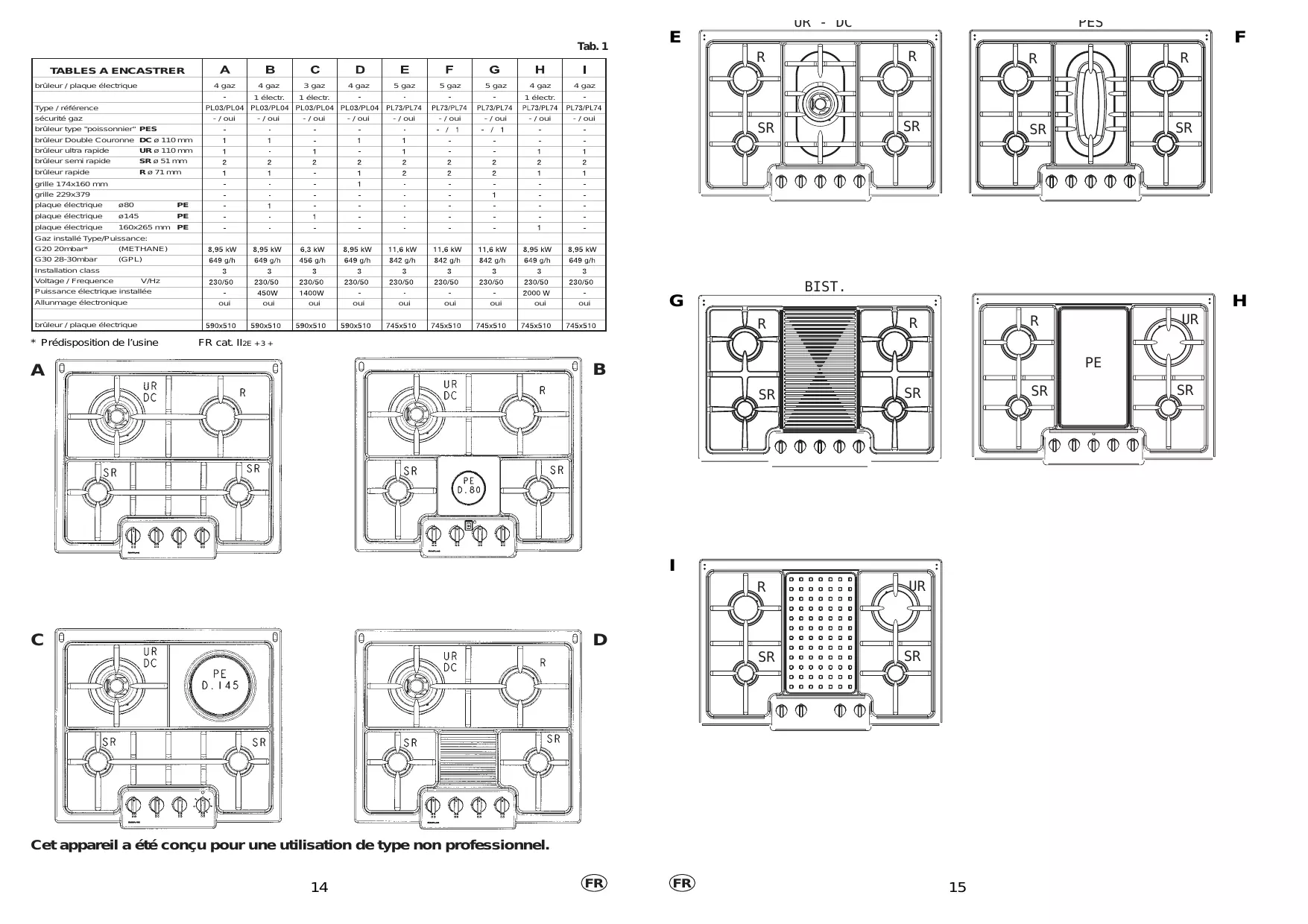 Pour allumer les brûleurs du plan de cuisson, approcher une flamme sur le brûleur puis appuyer et tourner le bouton correspondant vers la gauche jusqu’à la position maximum. Si les brûleurs ne sont pas utilisés pendant plusieurs jours, attendre quelques secondes avant d’allumer le gaz pour permettre de purger l’air des tuyaux. Pour les modèles équipés d’allumage électronique, procéder comme suit: — appuyer et tourner la manette dans le sens contraire des aiguilles d’une montre jusqu’à la petite étoile ★. — actionner l’allumage en appuyant sur la touche correspondante. Pour les tables de cuisson équipés d’un allumage automatique, il suffit d’appuyer et de tourner la manette jusqu’à la petite étoile ★. Le système d’allumage produira des étincelles tant la manette sera enfoncée. Si la flamme ne s’obtient pas dans les 5 secondes, ramener la manette à la position 0 et répéter l’opération. Pour les modèles équipés d’un système à sécurité (qui interrompt l’arrivée du gaz en cas d’extinction accidentelle de la flamme), l’allumage des brûleurs s’effectue comme décrit ci-dessus, en faisant attention à maintenir appuyé à fond la manette pendant environ 5-6 secondes après l’allumage de la flamme. Ces quelques secondes permettent au dispositif de sécurité de s’amorcer et la flamme restera permanente. ATTENTION: Vérifiez que les brûleurs et chapeaux de brûleurs sont installés correctement. Leur bon positionnement assure une combustion parfaite. Pour une meilleure utilisation des brûleurs il est recommandé d’utiliser des casseroles à fond plat dont le diamètre du fond est approprié à la plaque choisie (voir figure page 14-15). Type de Plaque A;B;C;D;E;F;G;H;I. A;B;C;D;E;F;G;H;I. A;B;C;D;E;F;G; H;I. A;B;C;D; E;F;G;H;I.