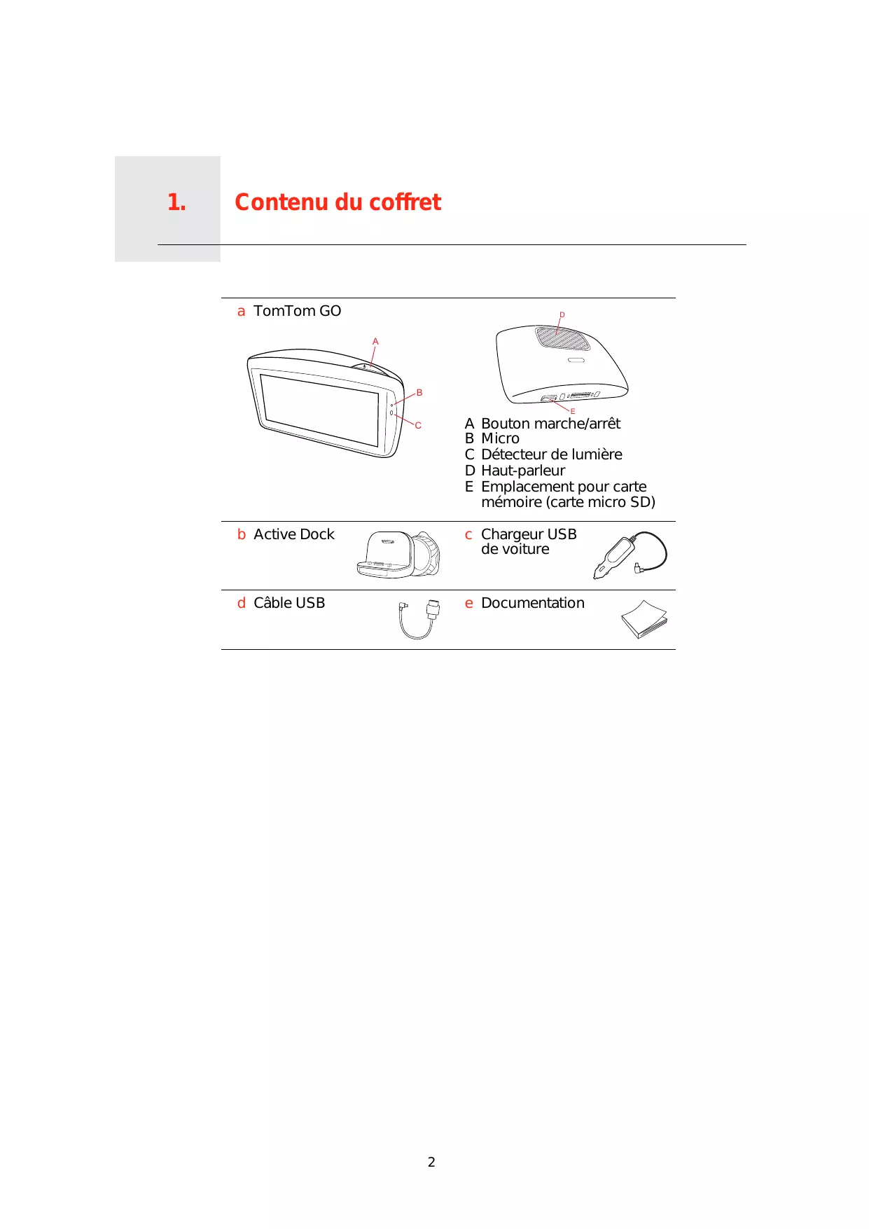 b Active Dock c Chargeur USB de voiture d Câble USB e Documentation