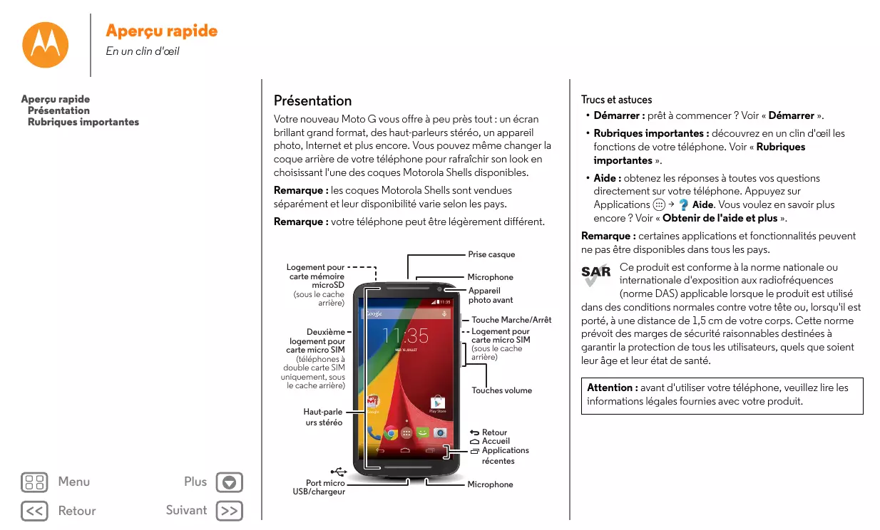Aperçu rapide En un clin d'œil Présentation Aperçu rapide Présentation Rubriques importantes Trucs et astuces Votre nouveau Moto G vous offre à peu près tout : un écran brillant grand format, des haut-parleurs stéréo, un appareil photo, Internet et plus encore. Vous pouvez même changer la coque arrière de votre téléphone pour rafraîchir son look en choisissant l'une des coques Motorola Shells disponibles. Remarque : les coques Motorola Shells sont vendues séparément et leur disponibilité varie selon les pays. Remarque : votre téléphone peut être légèrement différent. Prise casque Logement pour carte mémoire microSD (sous le cache arrière) Microphone 11:35 Haut-parle urs stéréo Touche Marche/Arrêt Logement pour carte micro SIM (sous le cache arrière) 11:35 Deuxième logement pour carte micro SIM (téléphones à double carte SIM uniquement, sous le cache arrière) Appareil photo avant MER 16JUILLET Touches volume Google Play Store Retour Accueil Applications récentes Menu Retour Plus Suivant Port micro USB/chargeur Microphone