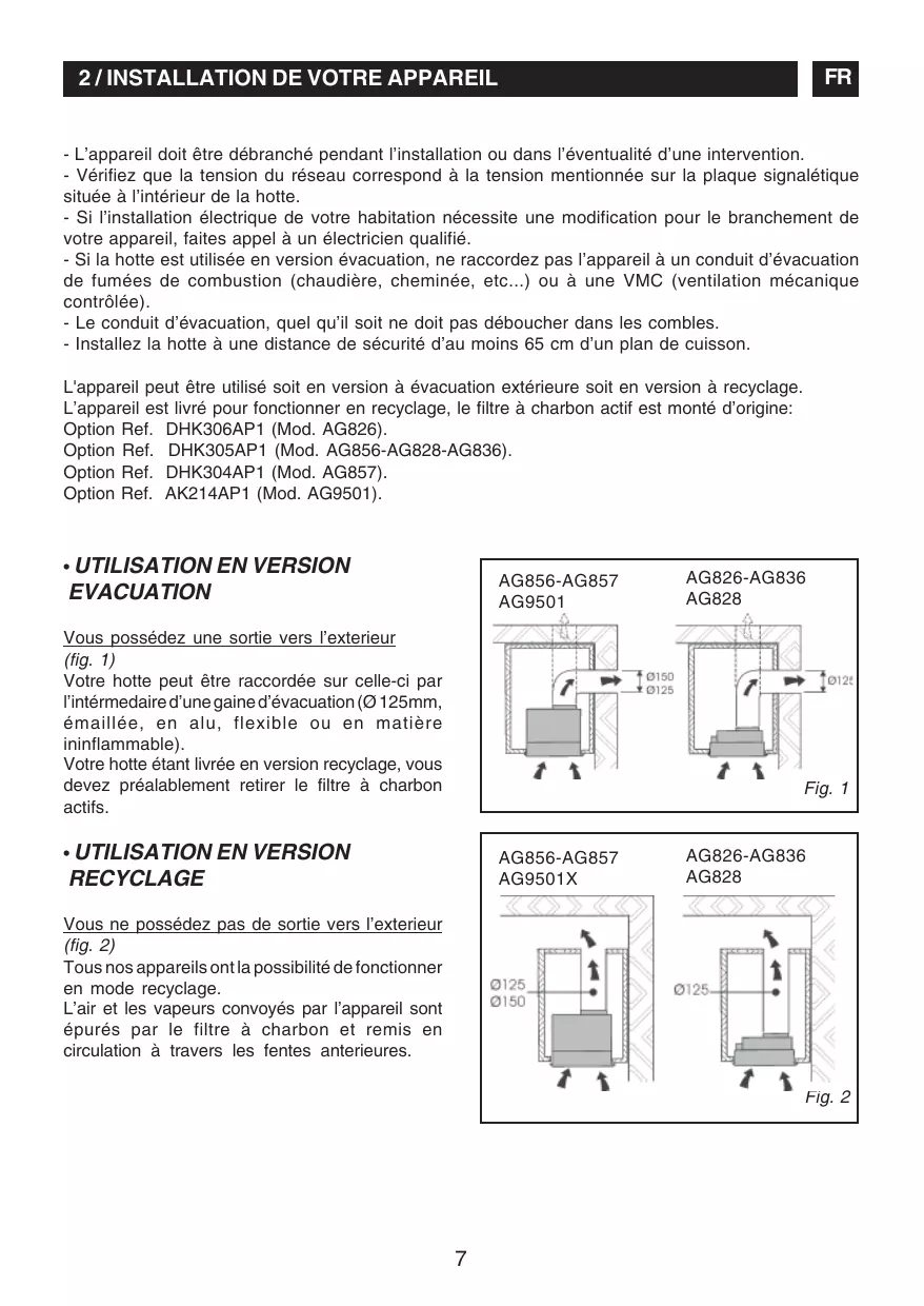 - UTILISATION EN VERSION AG856-AG857 AG9501 EVACUATION Vous possédez une sortie vers l’exterieur (fig. 1) Votre hotte peut être raccordée sur celle-ci par l’intérmedaire d’une gaine d’évacuation (Ø 125mm, émaillée, en alu, flexible ou en matière ininflammable). Votre hotte étant livrée en version recyclage, vous devez préalablement retirer le filtre à charbon actifs. AG826-AG836 AG828 Fig. 1