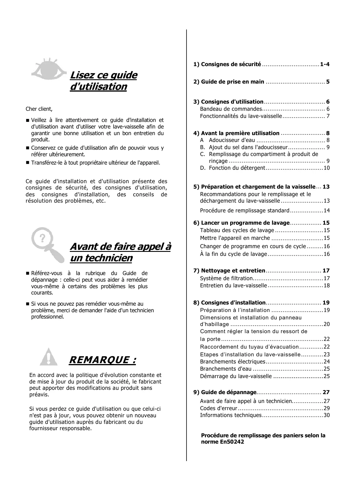 6) Lancer un programme de lavage 15 Tableau des cycles de lavage 15 Mettre l'appareil en marche 15 Changer de programme en cours de cycle 16 À la fin du cycle de lavage 16 7) Nettoyage et entretien 17 Système de filtration 17 Entretien du lave-vaisselle 18 8) Consignes d'installation 19 Préparation à l’installation 19 Dimensions et installation du panneau d’habillage 20 Comment régler la tension du ressort de la porte 22 Raccordement du tuyau d’évacuation 22 Etapes d’installation du lave-vaisselle 23 Branchements électriques 24 Branchements d'eau 25 Démarrage du lave-vaisselle 25 9) Guide de dépannage 27 Avant de faire appel à un technicien 27 Codes d'erreur 29 Informations techniques 30