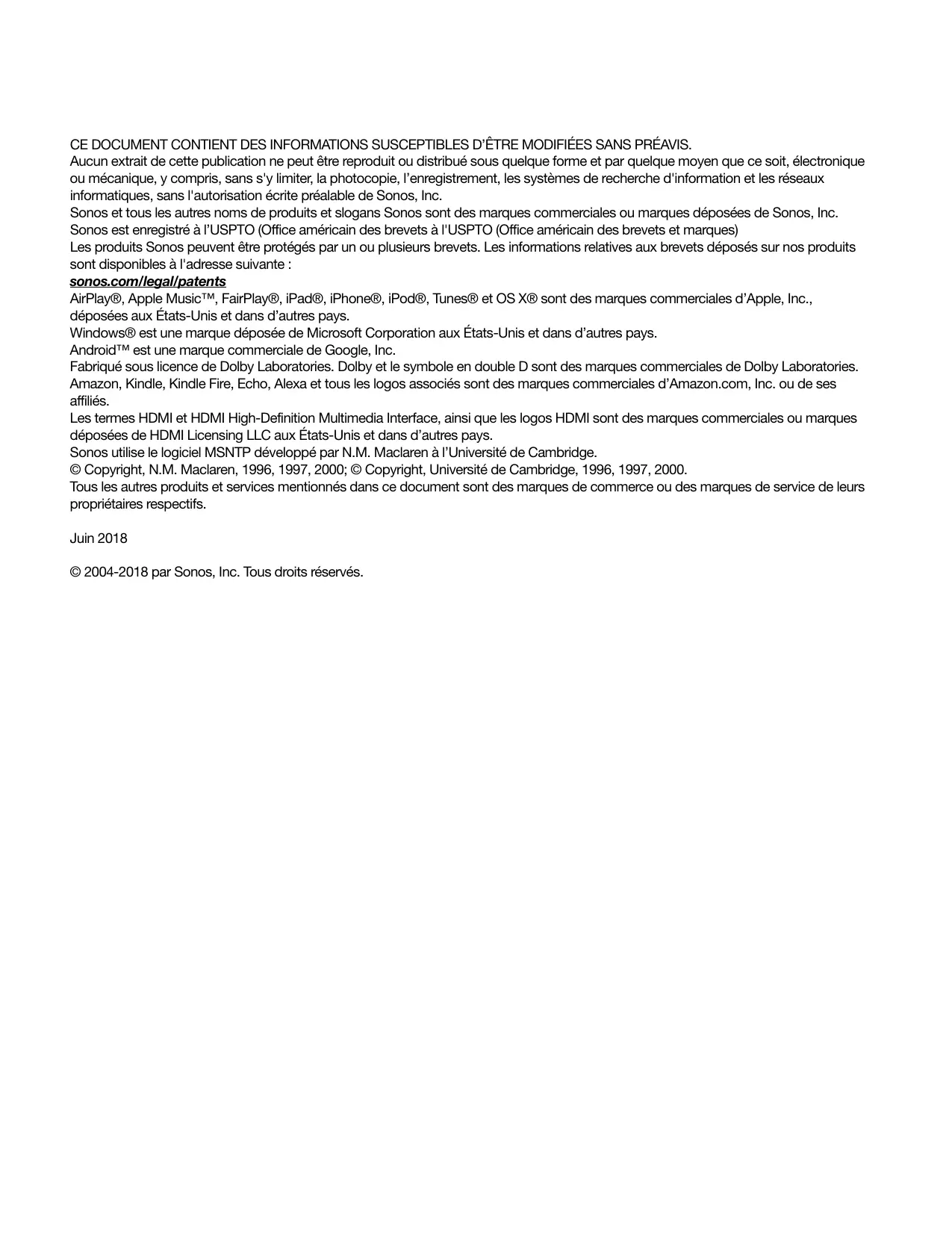 CE DOCUMENT CONTIENT DES INFORMATIONS SUSCEPTIBLES D’ÊTRE MODIFIÉES SANS PRÉAVIS. Aucun extrait de cette publication ne peut être reproduit ou distribué sous quelque forme et par quelque moyen que ce soit, électronique ou mécanique, y compris, sans s'y limiter, la photocopie, l’enregistrement, les systèmes de recherche d'information et les réseaux informatiques, sans l'autorisation écrite préalable de Sonos, Inc. Sonos et tous les autres noms de produits et slogans Sonos sont des marques commerciales ou marques déposées de Sonos, Inc. Sonos est enregistré à l’USPTO (Office américain des brevets à l'USPTO (Office américain des brevets et marques) Les produits Sonos peuvent être protégés par un ou plusieurs brevets. Les informations relatives aux brevets déposés sur nos produits sont disponibles à l'adresse suivante : sonos.com/legal/patents AirPlay®, Apple Music™, FairPlay®, iPad®, iPhone®, iPod®, Tunes® et OS X® sont des marques commerciales d’Apple, Inc., déposées aux États-Unis et dans d’autres pays. Windows® est une marque déposée de Microsoft Corporation aux États-Unis et dans d’autres pays. Android™ est une marque commerciale de Google, Inc. Fabriqué sous licence de Dolby Laboratories. Dolby et le symbole en double D sont des marques commerciales de Dolby Laboratories. Amazon, Kindle, Kindle Fire, Echo, Alexa et tous les logos associés sont des marques commerciales d’Amazon.com, Inc. ou de ses affiliés. Les termes HDMI et HDMI High-Definition Multimedia Interface, ainsi que les logos HDMI sont des marques commerciales ou marques déposées de HDMI Licensing LLC aux États-Unis et dans d’autres pays. Sonos utilise le logiciel MSNTP développé par N.M. Maclaren à l’Université de Cambridge. © Copyright, N.M. Maclaren, 1996, 1997, 2000; © Copyright, Université de Cambridge, 1996, 1997, 2000. Tous les autres produits et services mentionnés dans ce document sont des marques de commerce ou des marques de service de leurs propriétaires respectifs. Juin 2018 © 2004-2018 par Sonos, Inc. Tous droits réservés. Sonos Beam Beam est une barre de son compacte et intelligente qui offre une expérience comparable à celle d’une salle de cinéma sur votre TV.