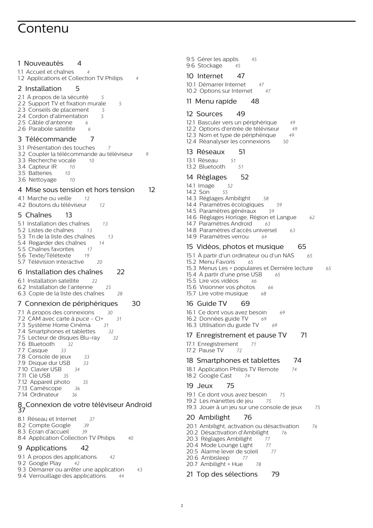 Paramètres Android 39 Paramètres écologiques 59 Paramètres d'accès universel 63 Pause TV 71 Photos, vidéos et musique 65 Pont hue 78 Problèmes, Chaînes 91 Problèmes, Connexion, Internet 92 Problèmes, Connexion, Wi-Fi 92 Problèmes, connexion HDMI 92 Problèmes, connexion USB 92 Problèmes, Image 91 Problèmes, langue menu incorrecte 92 Problèmes, Son 92 Problèmes, Télécommande 90 Programmes, Recommandations 79