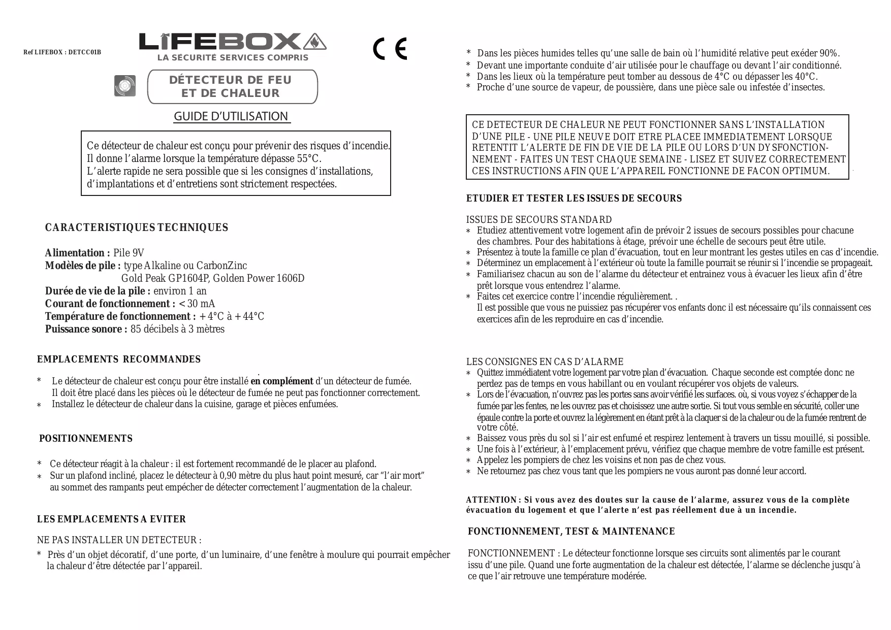 Ref LIFEBOX : DETCC01B LA SECURITE SERVICES COMPRIS DÉTECTEUR DE FEU ET DE CHALEUR GUIDE D’UTILISATION Ce détecteur de chaleur est conçu pour prévenir des risques d’incendie. Il donne l’alarme lorsque la température dépasse 55°C. L’alerte rapide ne sera possible que si les consignes d’installations, d’implantations et d’entretiens sont strictement respectées.