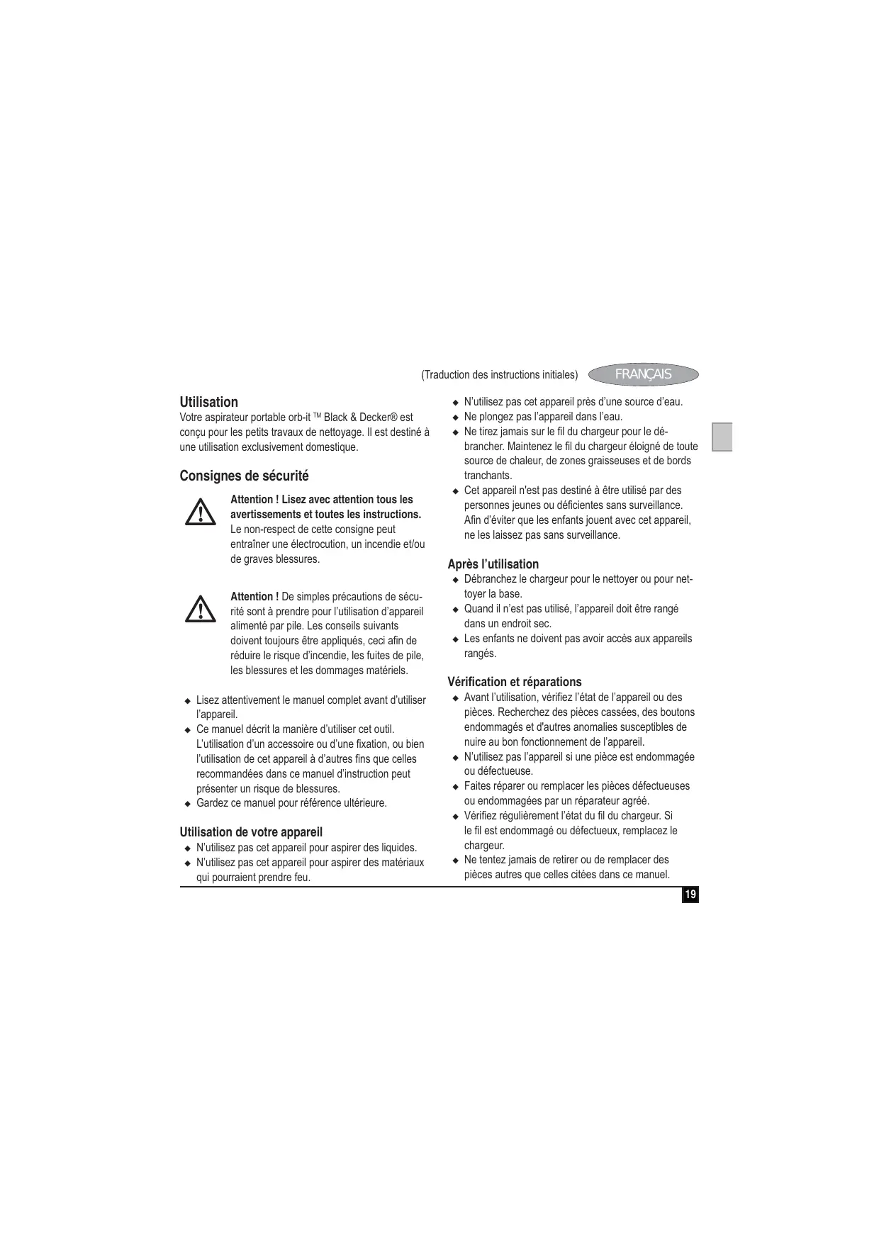 Téléchargez la notice de votre Aspirateur au format PDF gratuitement ! Retrouvez votre notice ORB48PWNC - BLACK & DECKER et reprennez votre appareil électronique en main. Sur cette page sont publiés tous les documents nécessaires à l'utilisation de votre appareil ORB48PWNC de la marque BLACK & DECKER.