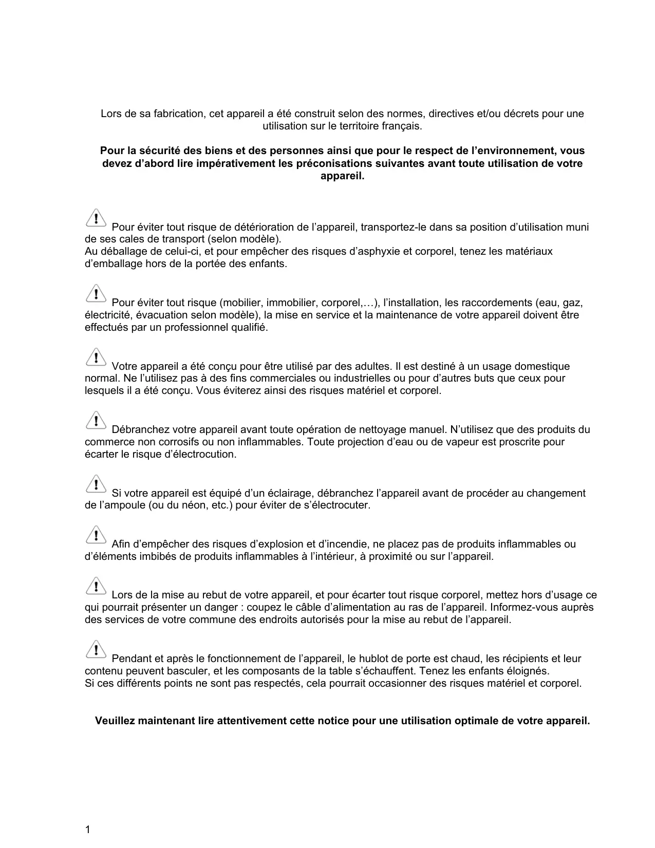 Cet appareil doit être installé par une personne qualifiée et selon les normes en vigueur. SOMMAIRE A l’attention de l’utilisateur A l’attention de l’installateur Avertissements importants