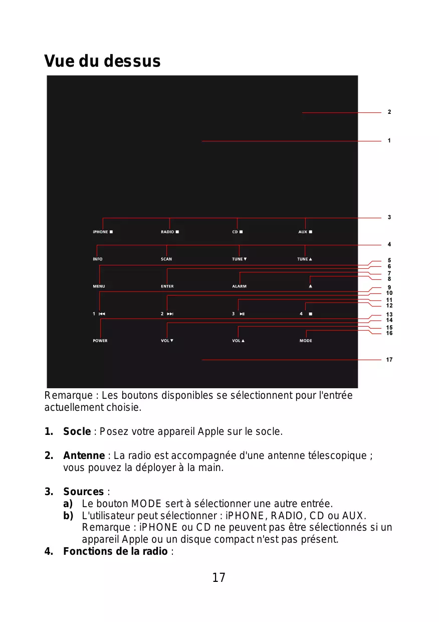 16. MODE: Pour changer d'entrée : iPHONE, RADIO, CD ou AUX.