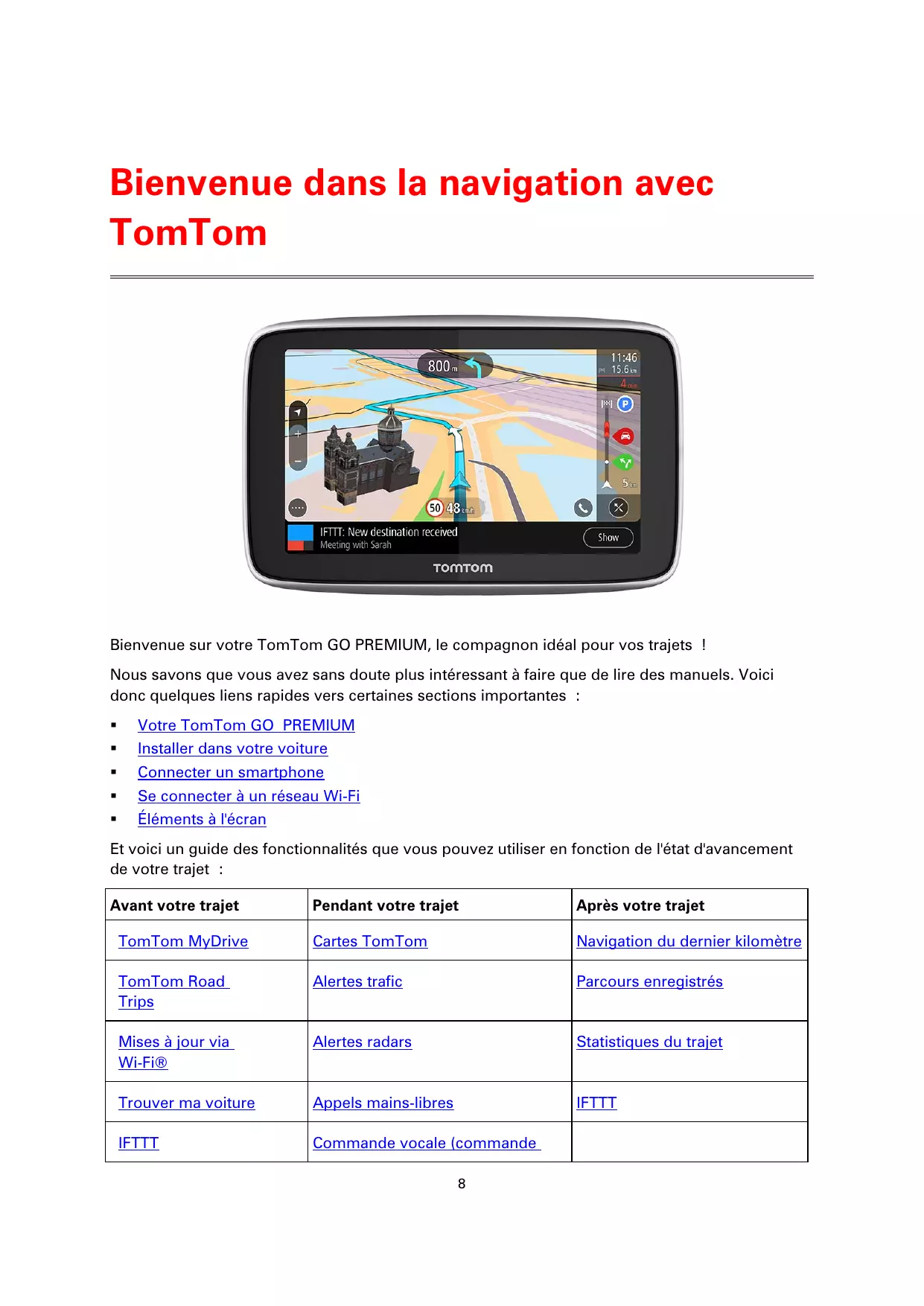 Bienvenue dans la navigation avec TomTom Bienvenue sur votre TomTom GO PREMIUM, le compagnon idéal pour vos trajets ! Nous savons que vous avez sans doute plus intéressant à faire que de lire des manuels. Voici donc quelques liens rapides vers certaines sections importantes :