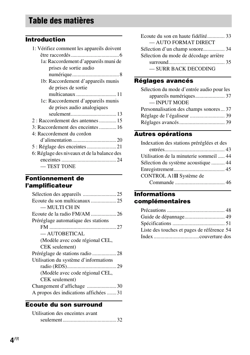 Les étapes 1a à 1c à partir de la page 8 décrivent la façon de raccorder les divers apparêils à cet amplituner. Avant de commencer, reportez-vous à « Appareils pouvant être raccordés » ci-dessous, qui vous indique les pages décrivant le raccordement de chaque apparéil.