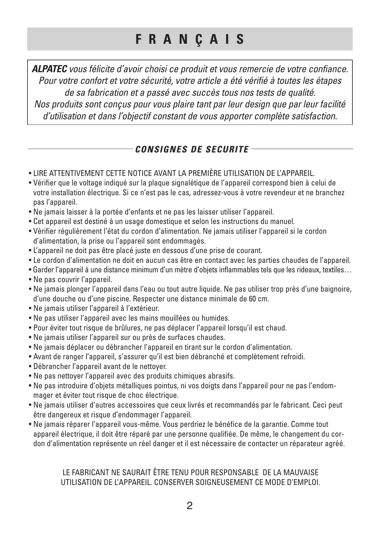 USER MANUAL F R A N Ç A I S ALPATEC vous félicite d’avoir choisi ce produit et vous remercie de votre confiance. Pour votre confort et votre sécurité, votre article a été vérifié à toutes les étapes de sa fabrication et a passé avec succès tous nos tests de qualité. Nos produits sont conçus pour vous plaire tant par leur design que par leur facilité d’utilisation et dans l’objectif constant de vous apporter complète satisfaction.