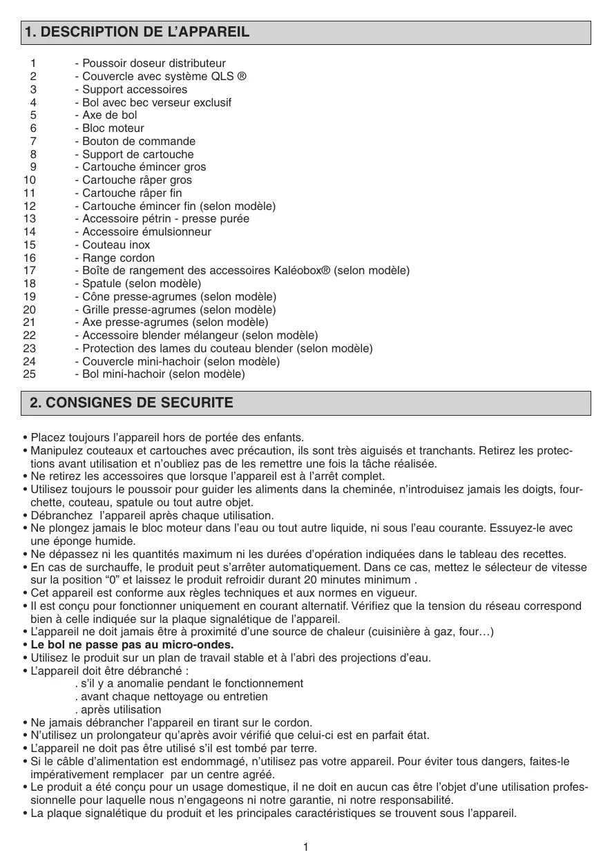 Support de cartouche Cartouche émincer gros Cartouche râper gros Cartouche râper fin • Ne retirez les accessoires que lorsque l’appareil est à l’arrêt complet. • Utilisez toujours le poussoir pour guider les aliments dans la cheminée, n’introduisez jamais les doigts, fourchette, couteau, spatule ou tout autre objet. • Débranchez l’appareil après chaque utilisation. • Ne plongez jamais le bloc moteur dans l’eau ou tout autre liquide, ni sous l’eau courante. Essuyez-le avec une éponge humide. • Ne dépassez ni les quantités maximum ni les durées d’opération indiquées dans le tableau des recettes. • En cas de surchauffe, le produit peut s’arrêter automatiquement. Dans ce cas, mettez le sélecteur de vitesse sur la position “0” et laissez le produit refroidir durant 20 minutes minimum . • Cet appareil est conforme aux règles techniques et aux normes en vigueur. • Il est conçu pour fonctionner uniquement en courant alternatif. Vérifiez que la tension du réseau correspond bien à celle indiquée sur la plaque signalétique de l’appareil. • L’appareil ne doit jamais être à proximité d’une source de chaleur (cuisinière à gaz, four…) • Le bol ne passe pas au micro-ondes. • Utilisez le produit sur un plan de travail stable et à l’abri des projections d’eau. • L’appareil doit être débranché : . s’il y a anomalie pendant le fonctionnement . avant chaque nettoyage ou entretien . après utilisation • Ne jamais débrancher l’appareil en tirant sur le cordon. • N’utilisez un prolongateur qu’après avoir vérifié que celui-ci est en parfait état. • L’appareil ne doit pas être utilisé s’il est tombé par terre. • Si le câble d’alimentation est endommagé, n’utilisez pas votre appareil. Pour éviter tous dangers, faites-le impérativement remplacer par un centre agréé. • Le produit a été conçu pour un usage domestique, il ne doit en aucun cas être l’objet d’une utilisation professionnelle pour laquelle nous n’engageons ni notre garantie, ni notre responsabilité. • La plaque signalétique du produit et les principales caractéristiques se trouvent sous l’appareil. 1