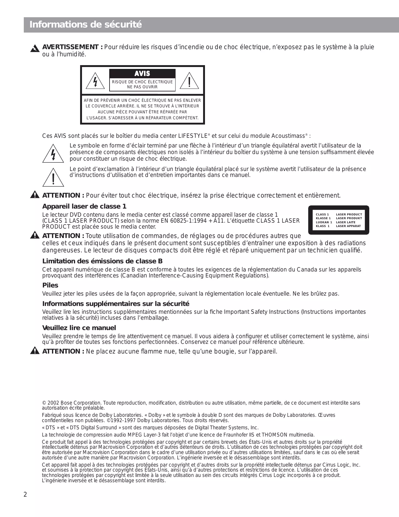 © 2002 Bose Corporation. Toute reproduction, modification, distribution ou autre utilisation, même partielle, de ce document est interdite sans autorisation écrite préalable.
