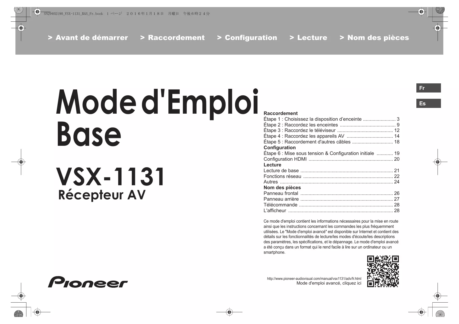 • L'afficheur Ce mode d'emploi contient les informations nécessaires pour la mise en route ainsi que les instructions concernant les commandes les plus fréquemment utilisées. Le "Mode d'emploi avancé" est disponible sur Internet et contient des détails sur les fonctionnalités de lecture/les modes d'écoute/les descriptions des paramètres, les spécifications, et le dépannage. Le mode d'emploi avancé a été conçu dans un format qui le rend facile à lire sur un ordinateur ou un smartphone. http://www.pioneer-audiovisual.com/manual/vsx1131/adv/fr.html Mode d'emploi avancé, cliquez ici SN29402190_VSX-1131_BAS_Fr.book 2 ページ p. 28
