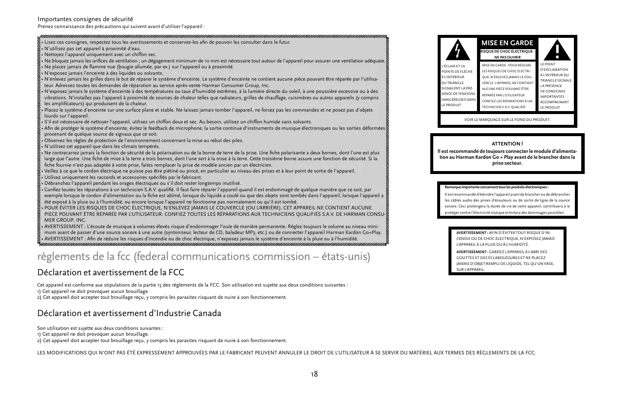 Importantes consignes de sécurité Prenez connaissance des précautions qui suivent avant d’utiliser l’appareil : • Lisez ces consignes, respectez tous les avertissements et conservez-les afin de pouvoir les consulter dans le futur. • N’utilisez pas cet appareil à proximité d’eau. • Nettoyez l’appareil uniquement avec un chiffon sec. • Ne bloquez jamais les orifices de ventilation ; un dégagement minimum de 10 mm est nécessaire tout autour de l’appareil pour assurer une ventilation adéquate. • Ne placez jamais de flamme nue (bougie allumée, par ex.) sur l’appareil ou à proximité. • N’exposez jamais l’enceinte à des liquides ou solvants. • N’enlevez jamais les grilles dans le but de réparer le système d’enceinte. Le système d’enceinte ne contient aucune pièce pouvant être réparée par l’utilisateur. Adressez toutes les demandes de réparation au service après-vente Harman Consumer Group, Inc. • N’exposez jamais le système d’enceinte à des températures ou taux d’humidité extrêmes, à la lumière directe du soleil, à une poussière excessive ou à des vibrations. N’installez pas l’appareil à proximité de sources de chaleur telles que radiateurs, grilles de chauffage, cuisinières ou autres appareils (y compris les amplificateurs) qui produisent de la chaleur. • Placez le système d’enceinte sur une surface plane et stable. Ne laissez jamais tomber l’appareil, ne forcez pas les commandes et ne posez pas d’objets lourds sur l’appareil. • S’il est nécessaire de nettoyer l’appareil, utilisez un chiffon doux et sec. Au besoin, utilisez un chiffon humide sans solvants. • Afin de protéger le système d’enceinte, évitez le feedback de microphone, la sortie continue d’instruments de musique électroniques ou les sorties déformées provenant de quelque source de signaux que ce soit. • Observez les règles de protection de l’environnement concernant la mise au rebut des piles. • N’utilisez cet appareil que dans les climats tempérés. • Ne contrecarrez jamais la fonction de sécurité de la polarisation ou de la borne de terre de la prise. Une fiche polarisante a deux bornes, dont l’une est plus large que l’autre. Une fiche de mise à la terre a trois bornes, dont l’une sert à la mise à la terre. Cette troisième borne assure une fonction de sécurité. Si la fiche fournie n’est pas adaptée à votre prise, faites remplacer la prise de modèle ancien par un électricien. • Veillez à ce que le cordon électrique ne puisse pas être piétiné ou pincé, en particulier au niveau des prises et à leur point de sortie de l’appareil. • Utilisez uniquement les raccords et accessoires spécifiés par le fabricant. • Débranchez l’appareil pendant les orages électriques ou s’il doit rester longtemps inutilisé. • Confiez toutes les réparations à un technicien S.A.V. qualifié. Il faut faire réparer l’appareil quand il est endommagé de quelque manière que ce soit, par exemple lorsque le cordon d’alimentation ou la fiche est abîmé, lorsque du liquide a coulé ou que des objets sont tombés dans l’appareil, lorsque l’appareil a été exposé à la pluie ou à l’humidité, ou encore lorsque l’appareil ne fonctionne pas normalement ou qu’il est tombé. • POUR ÉVITER LES RISQUES DE CHOC ÉLECTRIQUE, N’ENLEVEZ JAMAIS LE COUVERCLE (OU L’ARRIÈRE). CET APPAREIL NE CONTIENT AUCUNE PIÈCE POUVANT ÊTRE RÉPARÉE PAR L’UTILISATEUR. CONFIEZ TOUTES LES RÉPARATIONS AUX TECHNICIENS QUALIFIÉS S.A.V. DE Harman Consumer Group, Inc. • AVERTISSEMENT : L’écoute de musique à volumes élevés risque d’endommager l’ouïe de manière permanente. Réglez toujours le volume au niveau minimum avant de passer d’une source sonore à une autre (syntoniseur, lecteur de CD, baladeur MP3, etc.) ou de connecter l’appareil Harman Kardon Go+Play. • AVERTISSEMENT : Afin de réduire les risques d’incendie ou de choc électrique, n’exposez jamais le système d’enceinte à la pluie ou à l’humidité.