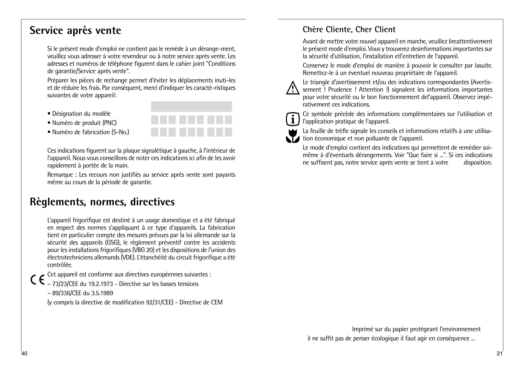 L’appareil frigorifique est destiné à un usage domestique et a été fabriqué en respect des normes s’appliquant à ce type d’appareils. La fabrication tient en particulier compte des mesures prévues par la loi allemande sur la sécurité des appareils (GSG), le règlement préventif contre les accidents pour les installations frigorifiques (VBG 20) et les dispositions de l’union des électrotechniciens allemands (VDE). L’étanchéité du circuit frigorifique a été contrôlée. Cet appareil est conforme aux directives européennes suivantes : – 73/23/CEE du 19.2.1973 - Directive sur les basses tensions – 89/336/CEE du 3.5.1989