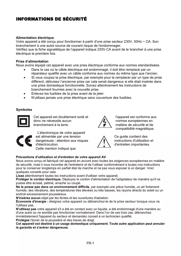 Alimentation électrique Votre appareil a été conçu pour fonctionner à partir d'une prise secteur 230V, 50Hz ~ CA. Son branchement à une autre source de courant risque de l'endommager. Vérifiez que la fiche signalétique de l’appareil indique 230V CA avant de le brancher à une prise électrique la première fois. Prise d’alimentation Nous avons équipé cet appareil avec une prise électrique conforme aux normes standardisées. Dans le cas où le câble électrique est endommagé, il doit être remplacé par un réparateur qualifié avec un câble conforme aux normes du même type que l’ancien. Si vous coupez la prise électrique, par exemple pour la remplacer par un type de prise différent, détruisez l’ancienne prise car cela serait dangereux si elle était insérée dans une prise domestique fonctionnelle. Suivez attentivement les instructions de branchement fournies avec la nouvelle prise. Enlevez les fusibles de la prise avant de la jeter. N’utilisez jamais une prise électrique sans couverture des fusibles. Symboles Cet appareil est doublement isolé et donc ne nécessite aucun branchement à la terre. L'électronique de votre appareil est alimentée par une tension dangereuse ; attention aux risques d'électrocution. Cette mention indique que l'appareil est conforme aux normes européennes en matière de sécurité et de compatibilité magnétique. Ce guide contient des instructions d'utilisation et d'entretien importantes. Précautions d'utilisation et d'entretien de votre appareil AV Nous avons conçu et fabriqué cet appareil en accord avec toutes les exigences européennes en matière de sécurité, mais il vous incombe de l'entretenir et de l'utiliser conformément à toutes nos instructions pour le conserver longtemps en parfait état de marche et ne pas vous exposer à un danger. Voici quelques conseils pour cela. Lisez attentivement toutes les instructions avant d'utiliser votre appareil. Protéger le cordon électrique. Déployez le cordon d'alimentation de l'adaptateur de manière qu'il ne puisse être écrasé, piétiné, arraché ou coupé. Ne le posez pas dans un environnement difficile, par exemple une pièce humide, un air fortement humide, des vibrations, des températures très élevées ou très basses, les rayons directs du soleil ou un endroit excessivement poussiéreux. N'insérez aucun objet par les fentes et les ouvertures d'aération. Économie d'énergie : éteignez votre appareil ou débranchez-le de la prise secteur lorsque vous ne l'utilisez pas. N'utilisez pas votre appareil s'il a été en contact avec un liquide, a été endommagé d'une manière ou d'une autre ou ne semble pas fonctionner normalement. Dans l'un de ces trois cas, débranchez immédiatement l'appareil du secteur et demandez conseil à un technicien qualifié. Protégez l'écran de la poussière et des traces de doigt. Cet appareil est destiné à un usage domestique uniquement. Toute autre application peut annuler la garantie et s'avérer dangereuse. FR-1 Aération Posez votre appareil sur une surface stable et plane, non exposée aux rayons directs du soleil et éloignée de toute source de chaleur. Pour une installation à l'intérieur d'un meuble, prévoyez un espace libre d'au-mois 10 cm tout autour de l'appareil. Veillez à ce que les ouvertures d'aération soient constamment dégagées, y compris celles se trouvant sous l'appareil. Toute surchauffe réduit la durée de vie de l'appareil et présente des risques de début d'incendie. Nettoyage Débranchez l'appareil du secteur avant toute opération de nettoyage et utilisez uniquement un chiffon légèrement humide. Les solvants chimiques et détergents puissants risquent d'endommager le revêtement. Évitez tout contact de l'écran avec un liquide. Piles Retirez les piles de la télécommande lorsque vous n'envisagez pas d'utiliser cette dernière avant longtemps. Elles risquent sinon de se détériorer et de fuir, et ce faisant d'endommager la télécommande sans pouvoir recourir à la garantie. Déposez vos piles usagées auprès d'installation de recyclage pour protéger votre environnement. Manipulation et utilisation de la pile :