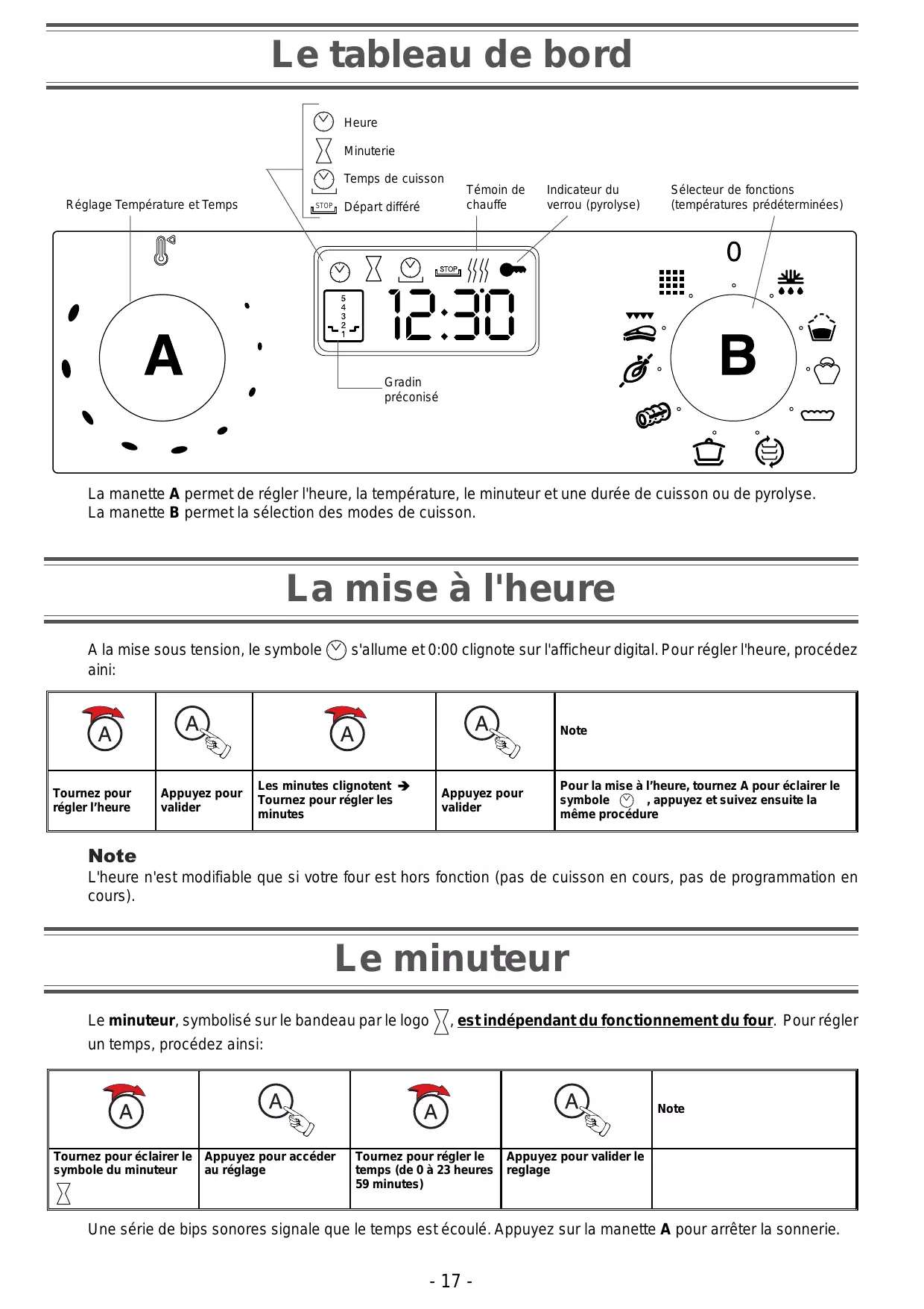 La manette A permet de regler l'heure, la température, le minuteur et une durée de cuisson ou de pyrolyse. La manette B permet la sélection des modes de cuisson.