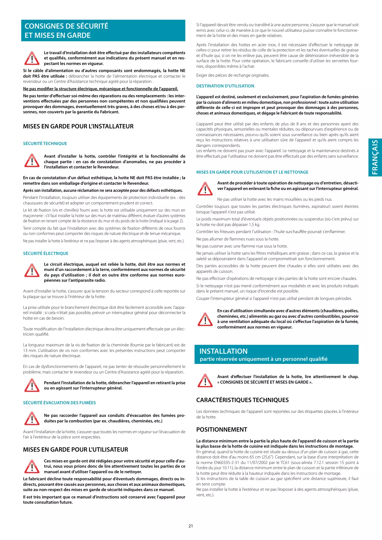 Si l'appareil devait être vendu ou transféré à une autre personne, s'assurer que le manuel soit remis avec celui-ci, de manière à ce que le nouvel utilisateur puisse connaître le fonctionnement de la hotte et des mises en garde relatives. Après l'installation des hottes en acier inox, il est nécessaire d'efectuer le nettoyage de celles-ci pour retirer les résidus de colle de la protection et les taches éventuelles de graisse et d'huile qui, si on ne les enlève pas, peuvent être cause de détérioration irréversible de la surface de la hotte. Pour cette opération, le fabricant conseille d'utiliser les serviettes fournies, disponibles même à l'achat. Le travail d'installation doit être efectué par des installateurs compétents et qualiiés, conformément aux indications du présent manuel et en respectant les normes en vigueur. Si le câble d'alimentation ou d’autres composants sont endommagés, la hotte NE doit PAS être utilisée : débrancher la hotte de l'alimentation électrique et contacter le revendeur ou un Centre d’Assistance technique agréé pour la réparation. Exiger des pièces de rechange originales. Ne pas tenter d'efectuer soi-même des réparations ou des remplacements : les interventions efectuées par des personnes non compétentes et non qualiiées peuvent provoquer des dommages, éventuellement très graves, à des choses et/ou à des personnes, non couverts par la garantie du Fabricant. L'appareil est destiné, seulement et exclusivement, pour l'aspiration de fumées générées par la cuisson d'aliments en milieu domestique, non professionnel : toute autre utilisation diférente de celle-ci est impropre et peut provoquer des dommages à des personnes, choses et animaux domestiques, et dégage le Fabricant de toute responsabilité.