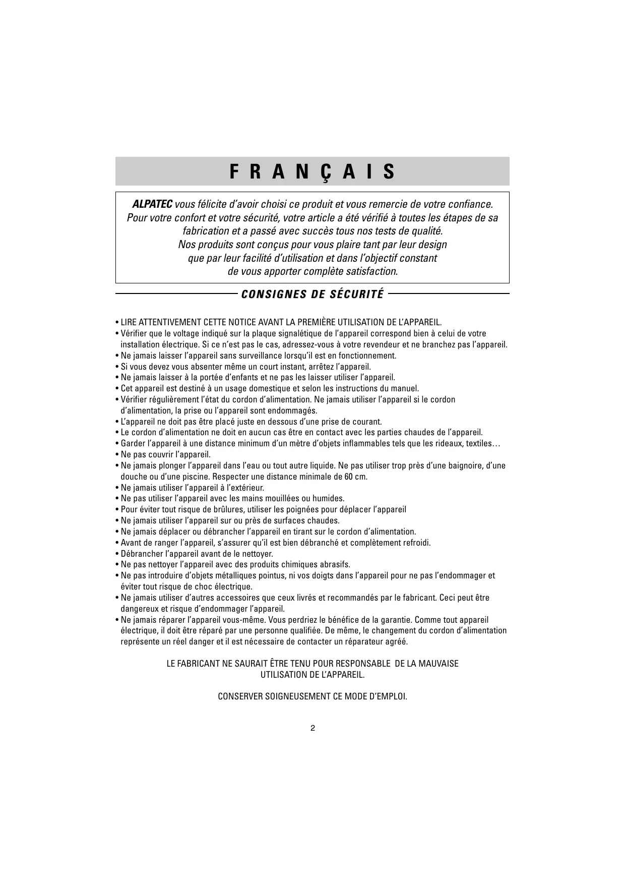 USER MANUAL F R A N Ç A I S ALPATEC vous félicite d’avoir choisi ce produit et vous remercie de votre confiance. Pour votre confort et votre sécurité, votre article a été vérifié à toutes les étapes de sa fabrication et a passé avec succès tous nos tests de qualité. Nos produits sont conçus pour vous plaire tant par leur design que par leur facilité d’utilisation et dans l’objectif constant de vous apporter complète satisfaction.