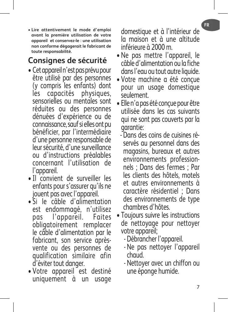 Lire attentivement le mode d’emploi avant la première utilisation de votre appareil et conservez-le : une utilisation non conforme dégagerait le fabricant de toute responsabilité. Consignes de sécurité