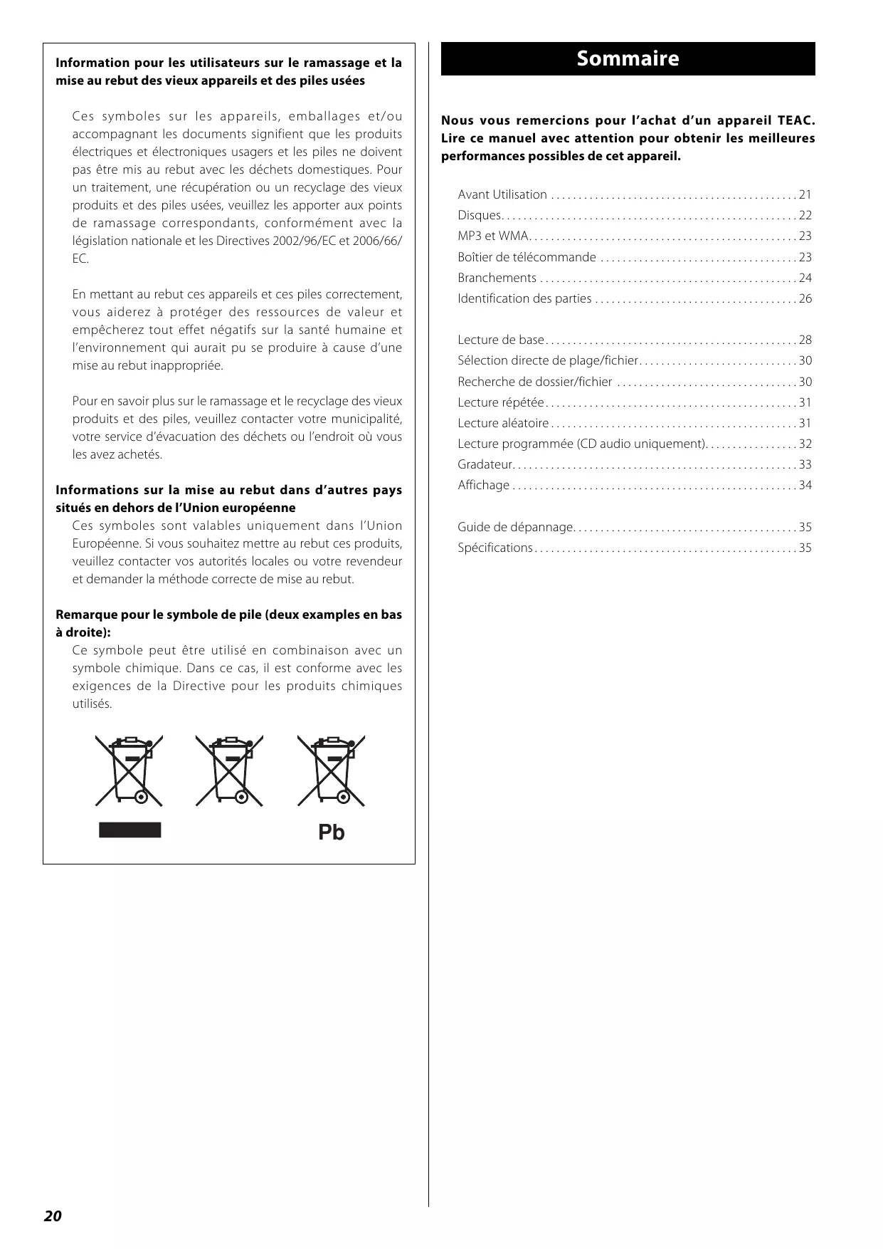 • ESPAÑOL Information pour les utilisateurs sur le ramassage et la mise au rebut des vieux appareils et des piles usées Ces symboles sur les appareils, emballages et/ou accompagnant les documents signifient que les produits électriques et électroniques usagers et les piles ne doivent pas être mis au rebut avec les déchets domestiques. Pour un traitement, une récupération ou un recyclage des vieux produits et des piles usées, veuillez les apporter aux points de ramassage correspondants, conformément avec la législation nationale et les Directives 2002/96/EC et 2006/66/ EC. Sommaire Nous vous remercions pour l’achat d’un appareil TEAC. Lire ce manuel avec attention pour obtenir les meilleures performances possibles de cet appareil. Avant Utilisation p. 21