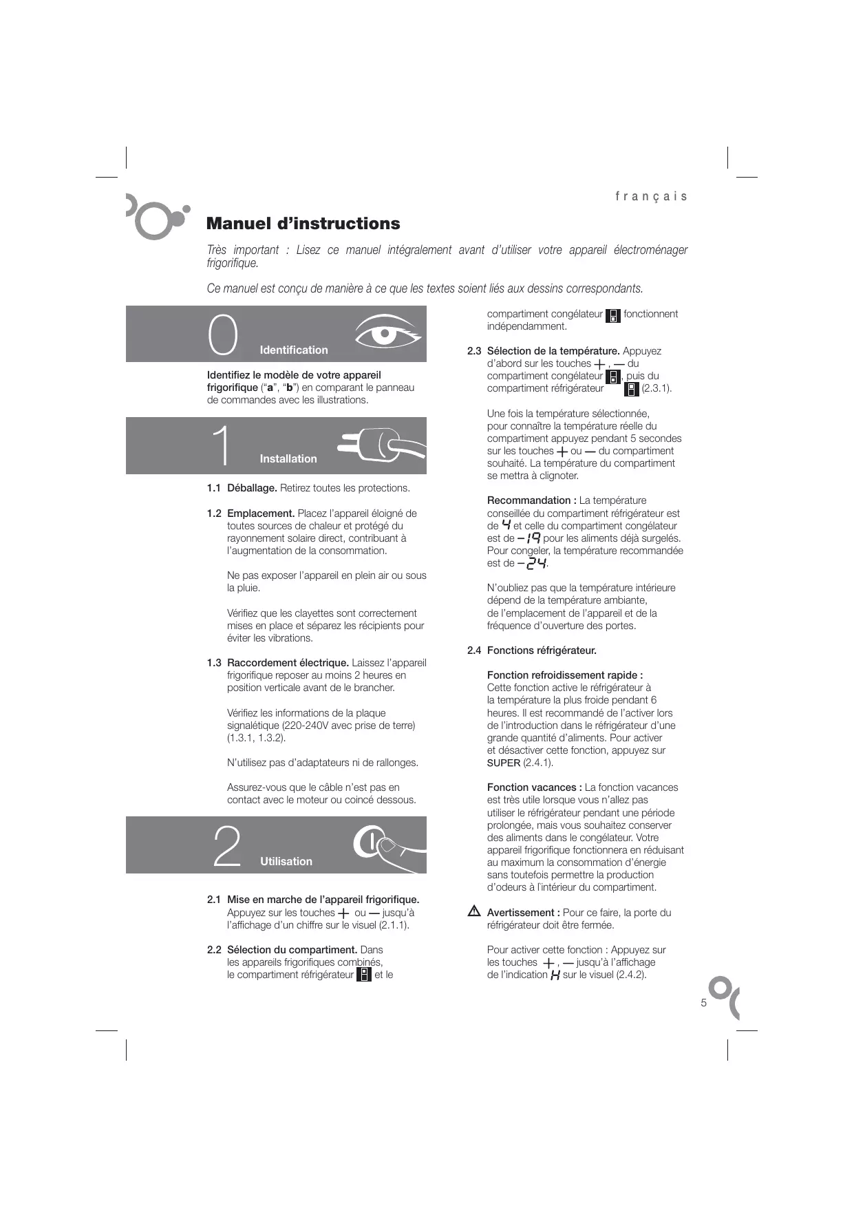 Pour désactiver cette fonction, répétez la démarche. Certains modèles permettent également d’éteindre le réfrigérateur. Pour ce faire, , appuyez sur les touches (2.4.3), jusqu’à ce que le visuel n’affiche aucun chiffre. 2.5 Fonctions congélateur. Fonction refroidissement rapide : Cette fonction active le congélateur au niveau le plus froid pendant 52 heures. Il est recommandé de l’activer 24 heures avant d’introduire dans le congélateur une grande quantité d’aliments. Pour activer et désactiver cette fonction : (2.5.1). Appuyez sur Connexion/déconnexion du congélateur: , Appuyez sur les touches (2.5.2) jusqu’à ce que le visuel n’affiche aucune température. Lorsque le congélateur s’éteint, le compartiment réfrigérateur cesse également de fonctionner. 2.6 Recommandations d’utilisation. • N’ouvrez pas les portes plus souvent que nécessaire et ne mettez pas d’aliments chauds dans le réfrigérateur. La chaleur augmente la température du réfrigérateur et, par conséquent, la consommation d’énergie. • Si votre appareil frigorifique est NO FROST n’obstruez pas les grilles de ventilation et veillez à laisser suffisamment d’espace entre les aliments pour permettre à l’air de circuler. • Ne pas entreposer de boissons gazeuses ou de bouteilles en verre contenant du liquide dans le congélateur, car celles-ci pourraient éclater. • Conservez les aliments dans des récipients hermétiques pour qu’ils ne dessèchent pas. • Ne consommez pas de glaces ou d’aliments très froids car ils sont susceptibles de produire des brûlures dans la bouche.