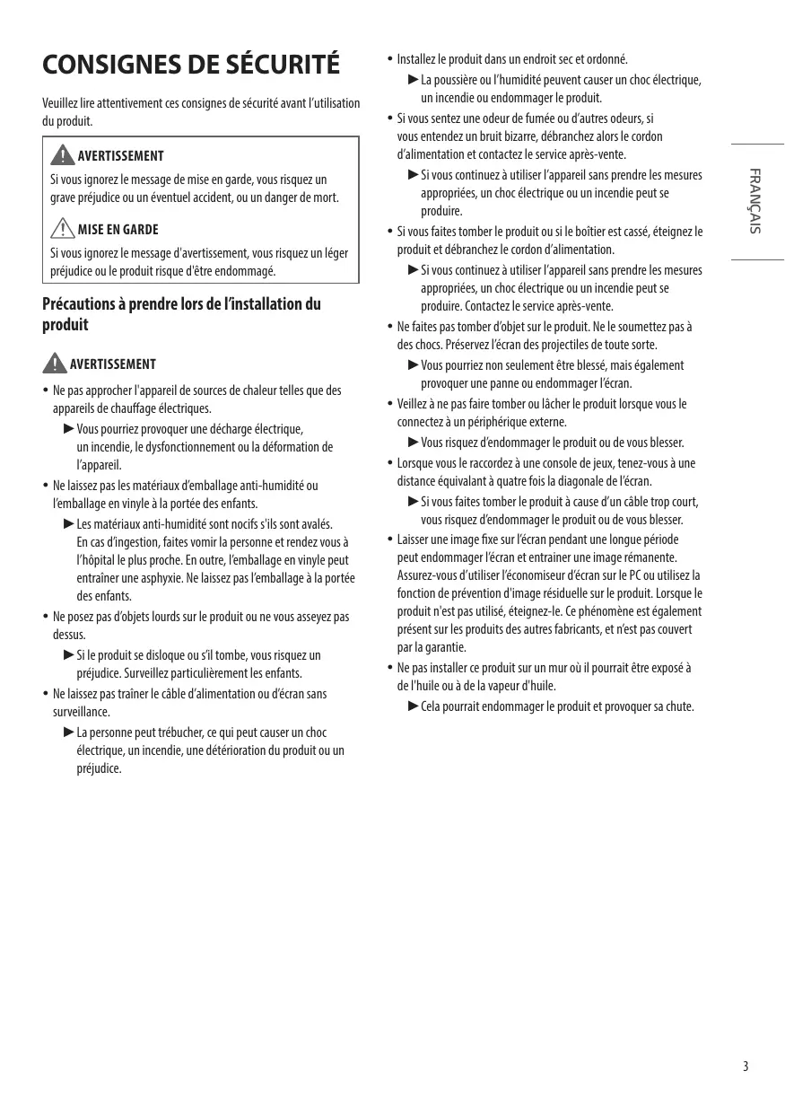 Si vous ignorez le message d'avertissement, vous risquez un léger préjudice ou le produit risque d'être endommagé. Précautions à prendre lors de l’installation du produit AVERTISSEMENT yy Ne pas approcher l'appareil de sources de chaleur telles que des appareils de chauffage électriques. ►Vous ► pourriez provoquer une décharge électrique, un incendie, le dysfonctionnement ou la déformation de l’appareil. yy Ne laissez pas les matériaux d’emballage anti-humidité ou l’emballage en vinyle à la portée des enfants. ►Les ► matériaux anti-humidité sont nocifs s'ils sont avalés. En cas d’ingestion, faites vomir la personne et rendez vous à l’hôpital le plus proche. En outre, l’emballage en vinyle peut entraîner une asphyxie. Ne laissez pas l’emballage à la portée des enfants. yy Ne posez pas d’objets lourds sur le produit ou ne vous asseyez pas dessus. ►Si ► le produit se disloque ou s’il tombe, vous risquez un préjudice. Surveillez particulièrement les enfants. yy Ne laissez pas traîner le câble d’alimentation ou d’écran sans surveillance. ►La ► personne peut trébucher, ce qui peut causer un choc électrique, un incendie, une détérioration du produit ou un préjudice. FRANÇAIS Si vous ignorez le message de mise en garde, vous risquez un grave préjudice ou un éventuel accident, ou un danger de mort. yy Installez le produit dans un endroit sec et ordonné. ►La ► poussière ou l’humidité peuvent causer un choc électrique, un incendie ou endommager le produit. yy Si vous sentez une odeur de fumée ou d’autres odeurs, si vous entendez un bruit bizarre, débranchez alors le cordon d’alimentation et contactez le service après-vente. ►Si ► vous continuez à utiliser l’appareil sans prendre les mesures appropriées, un choc électrique ou un incendie peut se produire. yy Si vous faites tomber le produit ou si le boîtier est cassé, éteignez le produit et débranchez le cordon d’alimentation. ►►Si vous continuez à utiliser l’appareil sans prendre les mesures appropriées, un choc électrique ou un incendie peut se produire. Contactez le service après-vente. yy Ne faites pas tomber d’objet sur le produit. Ne le soumettez pas à des chocs. Préservez l’écran des projectiles de toute sorte. ►Vous ► pourriez non seulement être blessé, mais également provoquer une panne ou endommager l’écran. yy Veillez à ne pas faire tomber ou lâcher le produit lorsque vous le connectez à un périphérique externe. ►Vous ► risquez d’endommager le produit ou de vous blesser. yy Lorsque vous le raccordez à une console de jeux, tenez-vous à une distance équivalant à quatre fois la diagonale de l’écran. ►Si ► vous faites tomber le produit à cause d’un câble trop court, vous risquez d’endommager le produit ou de vous blesser. yy Laisser une image fixe sur l’écran pendant une longue période peut endommager l’écran et entrainer une image rémanente. Assurez-vous d’utiliser l’économiseur d’écran sur le PC ou utilisez la fonction de prévention d'image résiduelle sur le produit. Lorsque le produit n'est pas utilisé, éteignez-le. Ce phénomène est également présent sur les produits des autres fabricants, et n’est pas couvert par la garantie. yy Ne pas installer ce produit sur un mur où il pourrait être exposé à de l'huile ou à de la vapeur d'huile. ►Cela ► pourrait endommager le produit et provoquer sa chute.