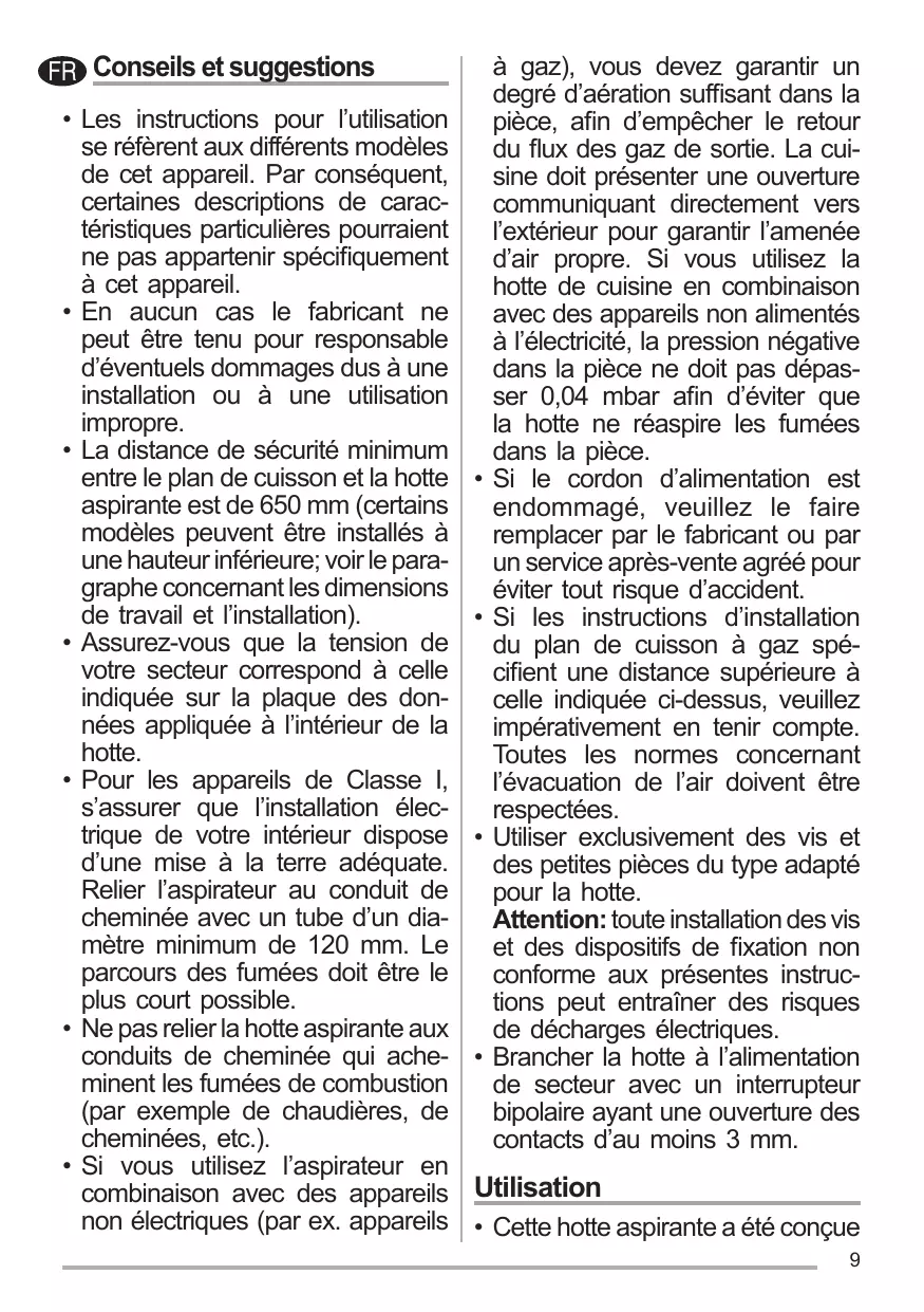 • En aucun cas le fabricant ne peut être tenu pour responsable d’éventuels dommages dus à une installation ou à une utilisation impropre. • La distance de sécurité minimum entre le plan de cuisson et la hotte aspirante est de 650 mm (certains modèles peuvent être installés à une hauteur inférieure; voir le paragraphe concernant les dimensions de travail et l’installation). • Assurez-vous que la tension de votre secteur correspond à celle indiquée sur la plaque des données appliquée à l’intérieur de la hotte. • Pour les appareils de Classe I, s’assurer que l’installation électrique de votre intérieur dispose d’une mise à la terre adéquate. Relier l’aspirateur au conduit de cheminée avec un tube d’un diamètre minimum de 120 mm. Le parcours des fumées doit être le plus court possible. • Ne pas relier la hotte aspirante aux conduits de cheminée qui acheminent les fumées de combustion (par exemple de chaudières, de cheminées, etc.). • Si vous utilisez l’aspirateur en combinaison avec des appareils non électriques (par ex. appareils
