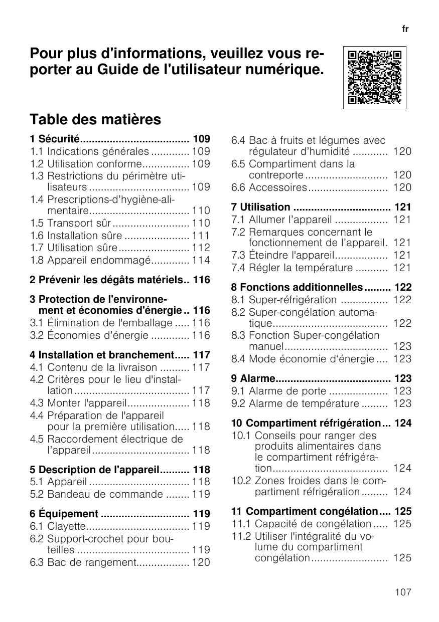 Pour plus d'informations, veuillez vous reporter au Guide de l'utilisateur numérique. Table des matières 1 Sécurité..................................... 109