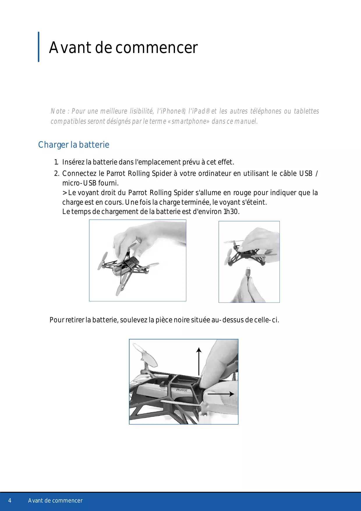 17 recycler ce produit Déclaration 17 de conformité Marques 17 déposées 2. Connectez le Parrot Rolling Spider à votre ordinateur en utilisant le câble USB / micro-USB fourni. > Le voyant droit du Parrot Rolling Spider s'allume en rouge pour indiquer que la charge est en cours. Une fois la charge terminée, le voyant s'éteint. Le temps de chargement de la batterie est d'environ 1h30.