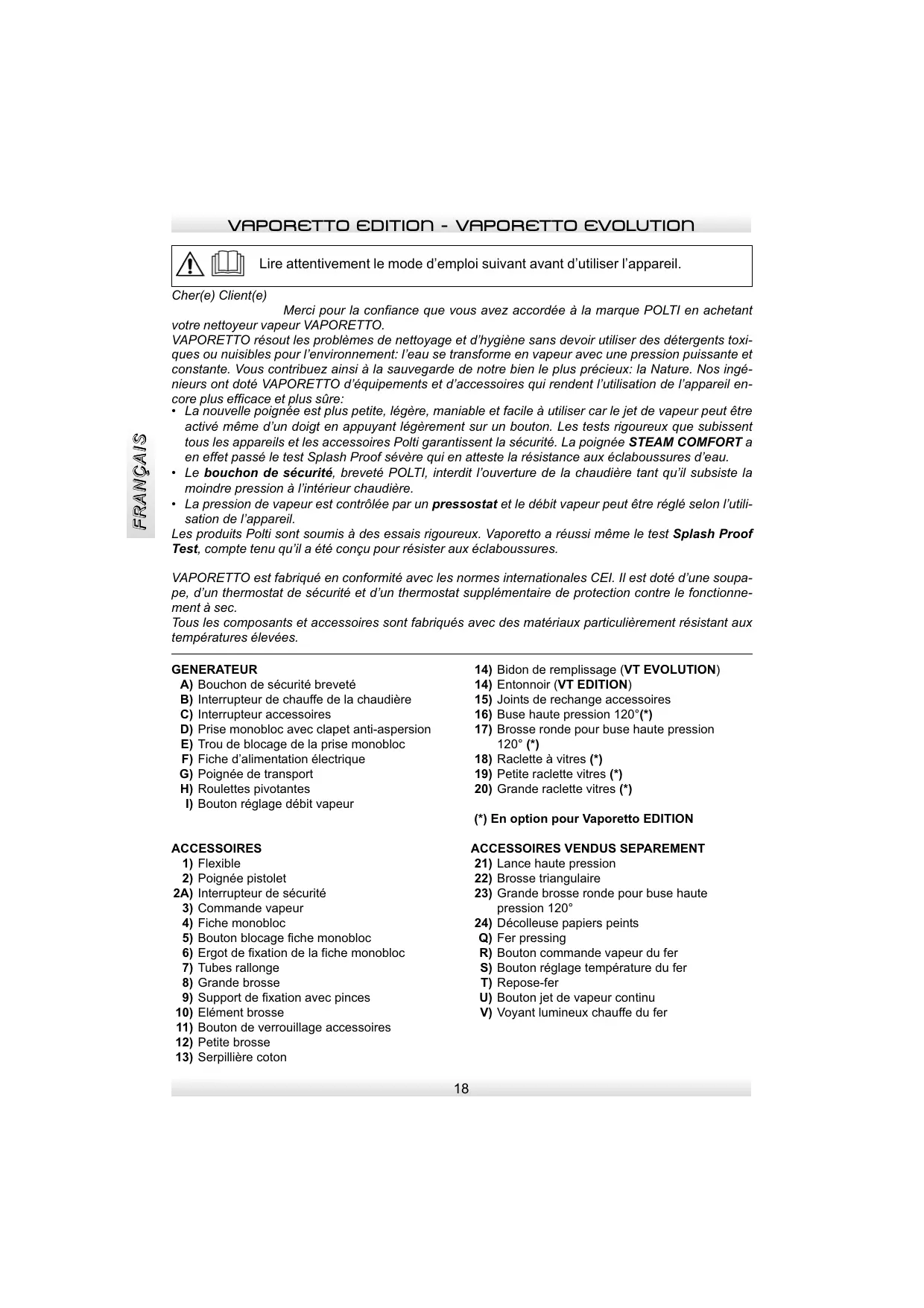 Lire attentivement le mode d’emploi suivant avant d’utiliser l’appareil. FRANÇAIS Cher(e) Client(e) Merci pour la confiance que vous avez accordée à la marque POLTI en achetant votre nettoyeur vapeur VAPORETTO. VAPORETTO résout les problèmes de nettoyage et d’hygiène sans devoir utiliser des détergents toxiques ou nuisibles pour l’environnement: l’eau se transforme en vapeur avec une pression puissante et constante. Vous contribuez ainsi à la sauvegarde de notre bien le plus précieux: la Nature. Nos ingénieurs ont doté VAPORETTO d’équipements et d’accessoires qui rendent l’utilisation de l’appareil encore plus efficace et plus sûre:
