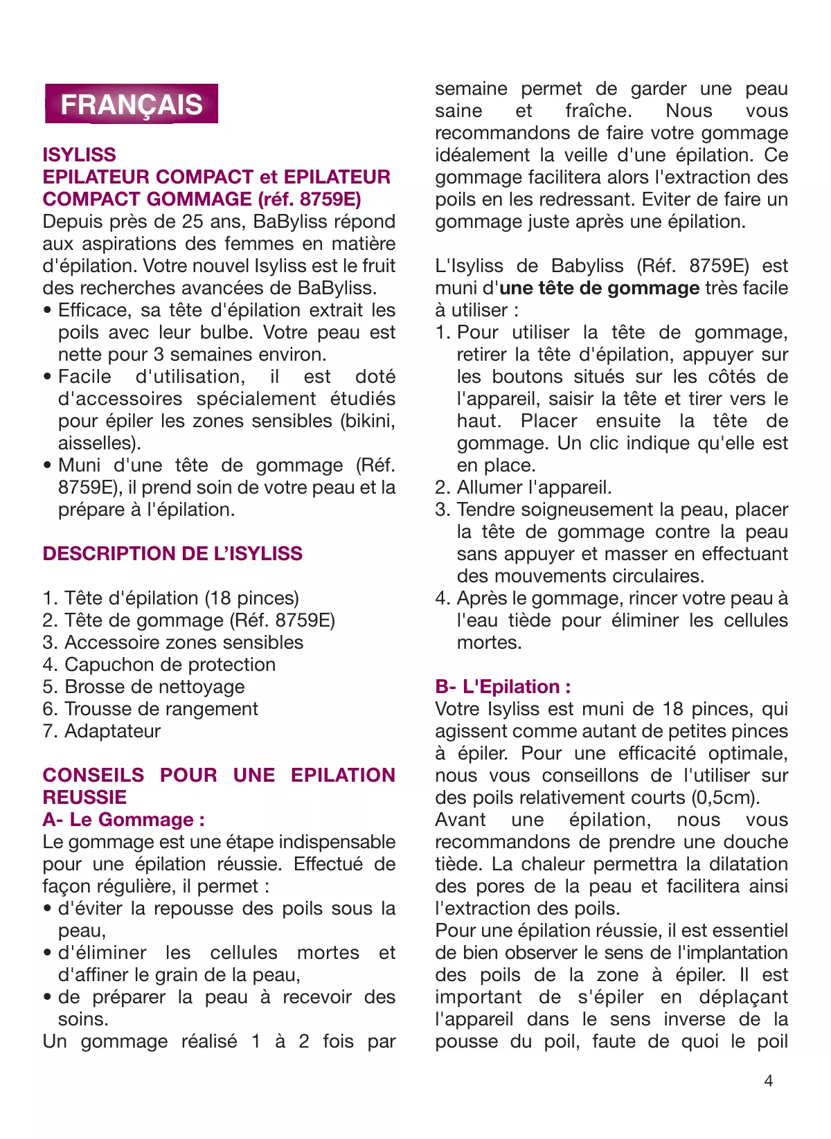 FRANÇAIS ISYLISS EPILATEUR COMPACT et EPILATEUR COMPACT GOMMAGE (réf. 8759E) Depuis près de 25 ans, BaByliss répond aux aspirations des femmes en matière d'épilation. Votre nouvel Isyliss est le fruit des recherches avancées de BaByliss.