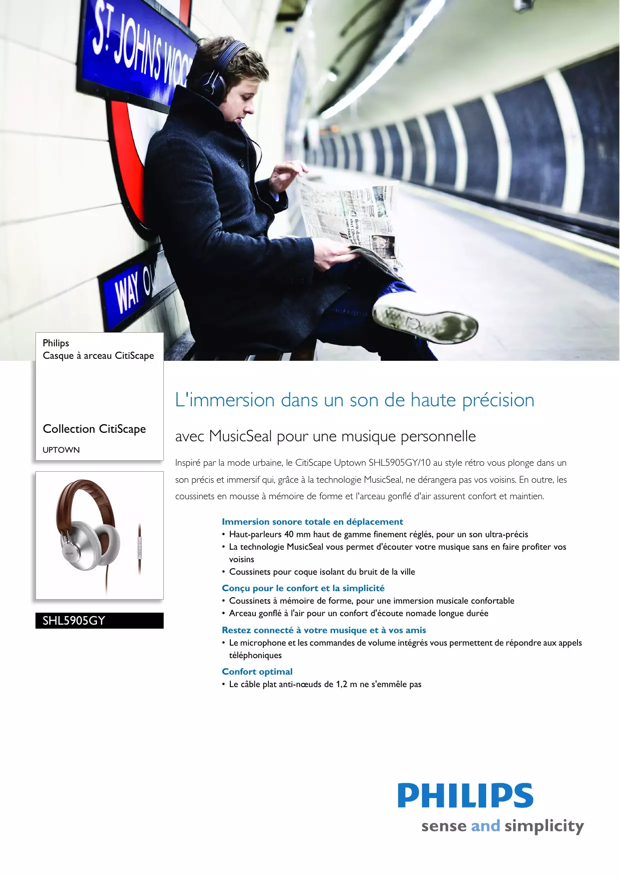 - Le câble plat anti-nœuds de 1,2 m ne s'emmêle pas SHL5905GY/10 Casque à arceau CitiScape Collection CitiScape UPTOWN Points forts Arceau gonflé à l'air l'excellence acoustique acquise au fil des années par Philips, le casque CitiScape a été soigneusement conçu pour reproduire un son ultra-précis, pour un plaisir d'écoute nomade incomparable. totalement confortable, même lors d'une utilisation prolongée. Coussinets doux, mousse à mém. de forme MusicSeal Arceau gonflé à l'air pour un confort d'écoute nomade longue durée Micro et commandes volume intégrés Votre casque CitiScape est équipé d'un microphone et de commandes de volume intégrés vous permettant de passer facilement de l'écoute de musique aux appels téléphoniques. Restez connecté à votre musique, et aux personnes qui vous sont chères. Qu'il s'agisse des riffs entêtants d'un groupe de métal funk ou des envolées lyriques d'une grande cantatrice, avec la technologie MusicSeal, votre casque CitiScape préserve la tranquillité de vos voisins. Grâce aux parois doubles de la coque et aux bords parfaitement joints entre la coque et le coussinet, aucune note ne s'échappe, tandis que le bruit ambiant ne pénètre pas. Rien ne vient perturber votre plaisir d'écoute. Les coussinets à mémoire de forme ultra-doux et souples de ce casque Philips épousent confortablement et parfaitement le contour de vos oreilles afin de les isoler entièrement. Conçus pour un maintien optimal quelle que soit la forme de votre tête, ils permettent également une immersion totale et prolongée dans la musique. Ce casque est si confortable que vous oublierez même que vous le portez. Câble plat anti-nœuds Coussinets pour coque isolant du bruit Son haute précision Plongez dans le son limpide et richement détaillé offert par les haut-parleurs 40 mm haut de gamme finement réglés. Bénéficiant de Profitez de la ville, mais pas de son bruit, grâce aux coussinets pour coque isolant du bruit. Incroyablement doux, ils créent un cocon autour des haut-parleurs et de vos oreilles, pour une isolation parfaite. Ainsi, vous pourrez discerner tous les détails sonores de votre musique, pour un plus grand plaisir d'écoute. Conçu pour minimiser la pression au niveau des oreilles, votre casque CitiScape est Dites adieux aux câbles pleins de nœuds lorsque vous les sortez du sac. Le câble plat anti-nœuds de 1,2 m de votre casque CitiScape ne s'emmêle jamais. Vous pouvez désormais vous concentrer sur ce qui est important : la musique, où que vous soyez. SHL5905GY/10 Casque à arceau CitiScape Collection CitiScape UPTOWN Caractéristiques Son