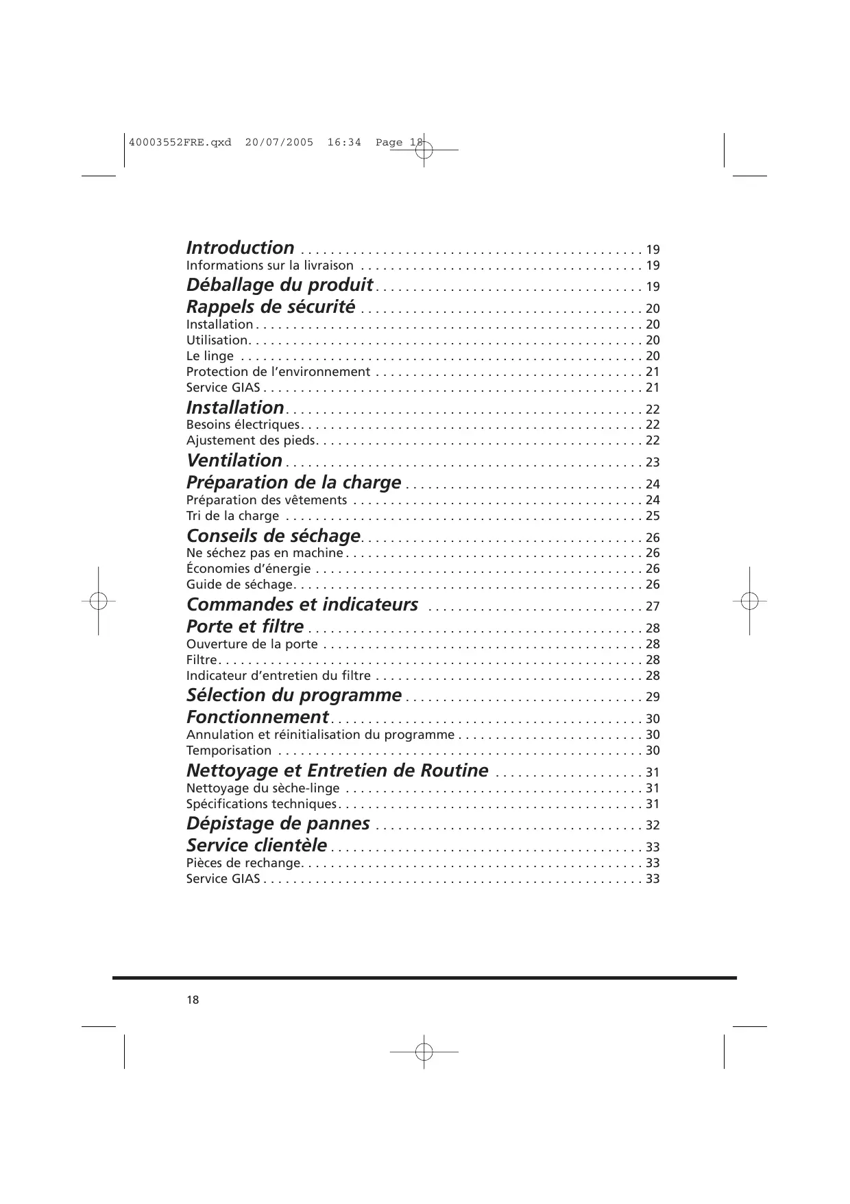 40003552FRE.qxd 20/07/2005 16:34 Page 18 Introduction . . . . . . . . . . . . . . . . . . . . . . . . . . . . . . . . . . . . . . . . . . . . . . 19 Informations sur la livraison . . . . . . . . . . . . . . . . . . . . . . . . . . . . . . . . . . . . . . 19 Déballage du produit . . . . . . . . . . . . . . . . . . . . . . . . . . . . . . . . . . . . 19 Rappels de sécurité . . . . . . . . . . . . . . . . . . . . . . . . . . . . . . . . . . . . . . 20 Installation . . . . . . . . . . . . . . . . Utilisation. . . . . . . . . . . . . . . . . Le linge . . . . . . . . . . . . . . . . . . Protection de l’environnement Service GIAS . . . . . . . . . . . . . . .