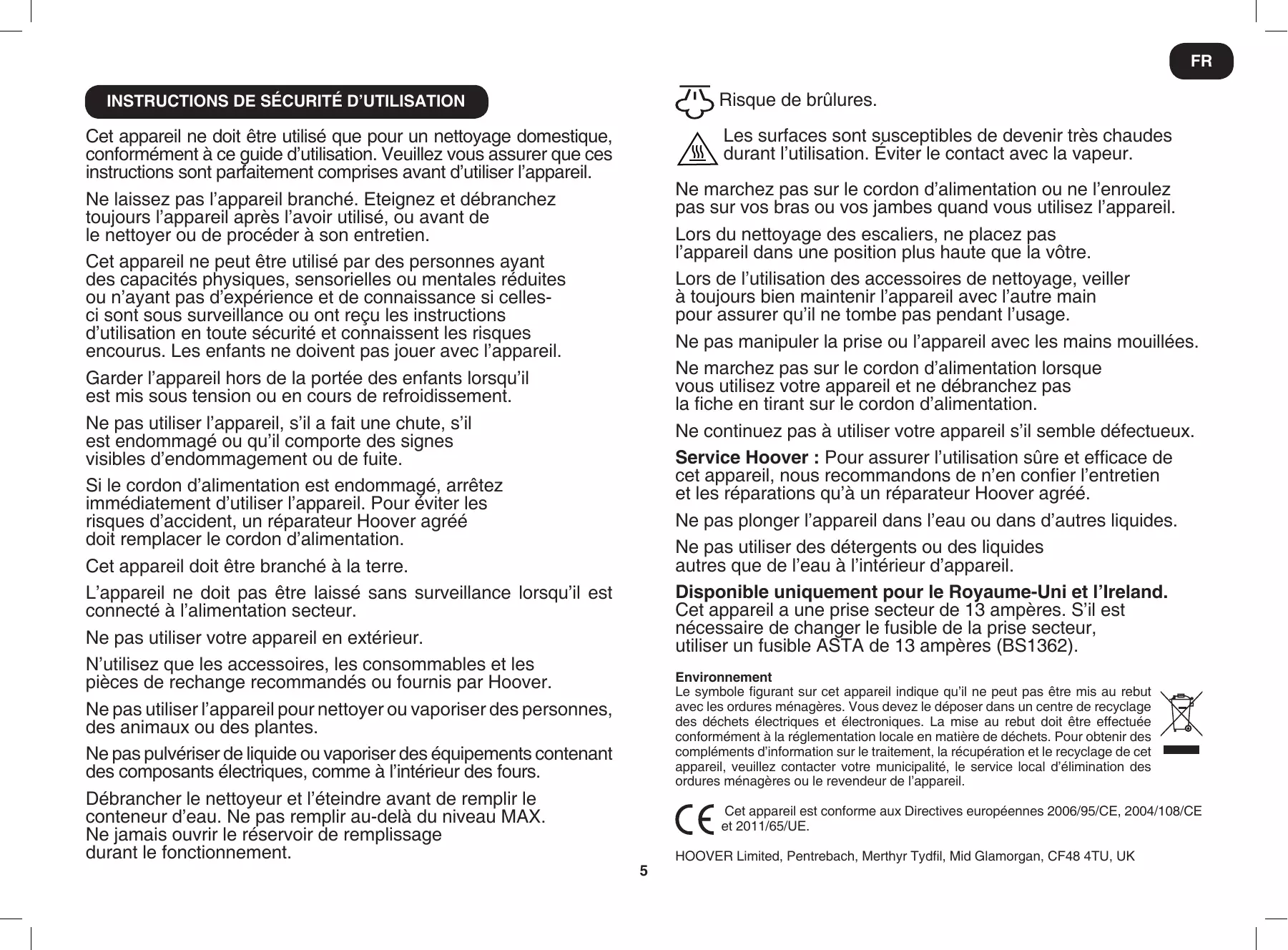 Ne marchez pas sur le cordon d’alimentation ou ne l’enroulez pas sur vos bras ou vos jambes quand vous utilisez l’appareil. Lors du nettoyage des escaliers, ne placez pas l’appareil dans une position plus haute que la vôtre. Lors de l’utilisation des accessoires de nettoyage, veiller à toujours bien maintenir l’appareil avec l’autre main pour assurer qu’il ne tombe pas pendant l’usage. Ne pas manipuler la prise ou l’appareil avec les mains mouillées. Ne marchez pas sur le cordon d’alimentation lorsque vous utilisez votre appareil et ne débranchez pas la fiche en tirant sur le cordon d’alimentation. Ne continuez pas à utiliser votre appareil s’il semble défectueux. Service Hoover : Pour assurer l’utilisation sûre et efficace de cet appareil, nous recommandons de n’en confier l’entretien et les réparations qu’à un réparateur Hoover agréé. Ne pas plonger l’appareil dans l’eau ou dans d’autres liquides. Ne pas utiliser des détergents ou des liquides autres que de l’eau à l’intérieur d’appareil. Disponible uniquement pour le Royaume-Uni et l’Ireland. Cet appareil a une prise secteur de 13 ampères. S’il est nécessaire de changer le fusible de la prise secteur, utiliser un fusible ASTA de 13 ampères (BS1362). Environnement Le symbole figurant sur cet appareil indique qu’il ne peut pas être mis au rebut avec les ordures ménagères. Vous devez le déposer dans un centre de recyclage des déchets électriques et électroniques. La mise au rebut doit être effectuée conformément à la réglementation locale en matière de déchets. Pour obtenir des compléments d’information sur le traitement, la récupération et le recyclage de cet appareil, veuillez contacter votre municipalité, le service local d’élimination des ordures ménagères ou le revendeur de l’appareil. Cet appareil est conforme aux Directives européennes 2006/95/CE, 2004/108/CE et 2011/65/UE.