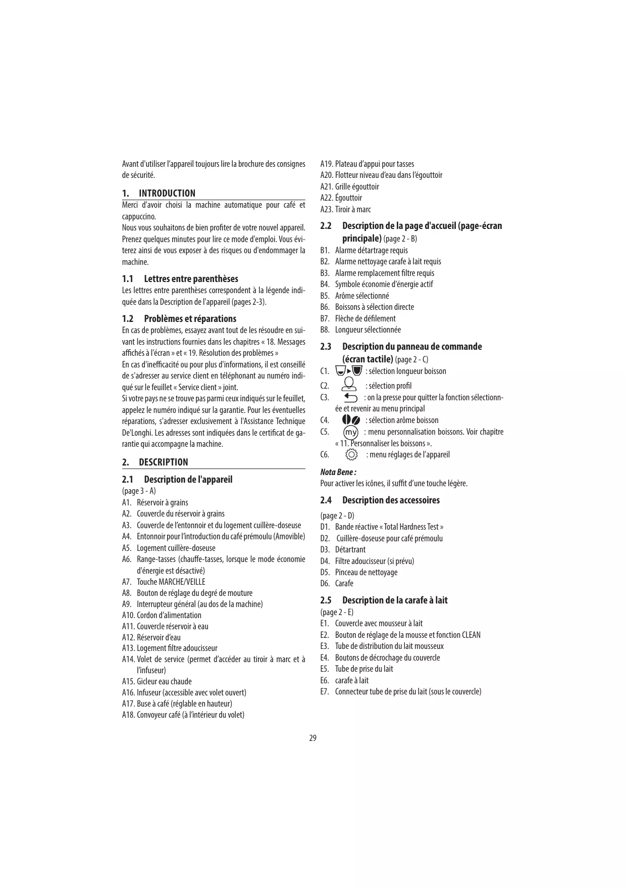 2. DESCRIPTION 29 2.1 Description de l'appareil 29 2.2 Description de la page d'accueil (page-écran principale) (page 2 - B) 29 2.3 Description du panneau de commande (écran tactile) (page 2 - C) 29 2.4 Description des accessoires 29 2.5 Description de la carafe à lait 29 2.6 Description de la buse à eau chaude30