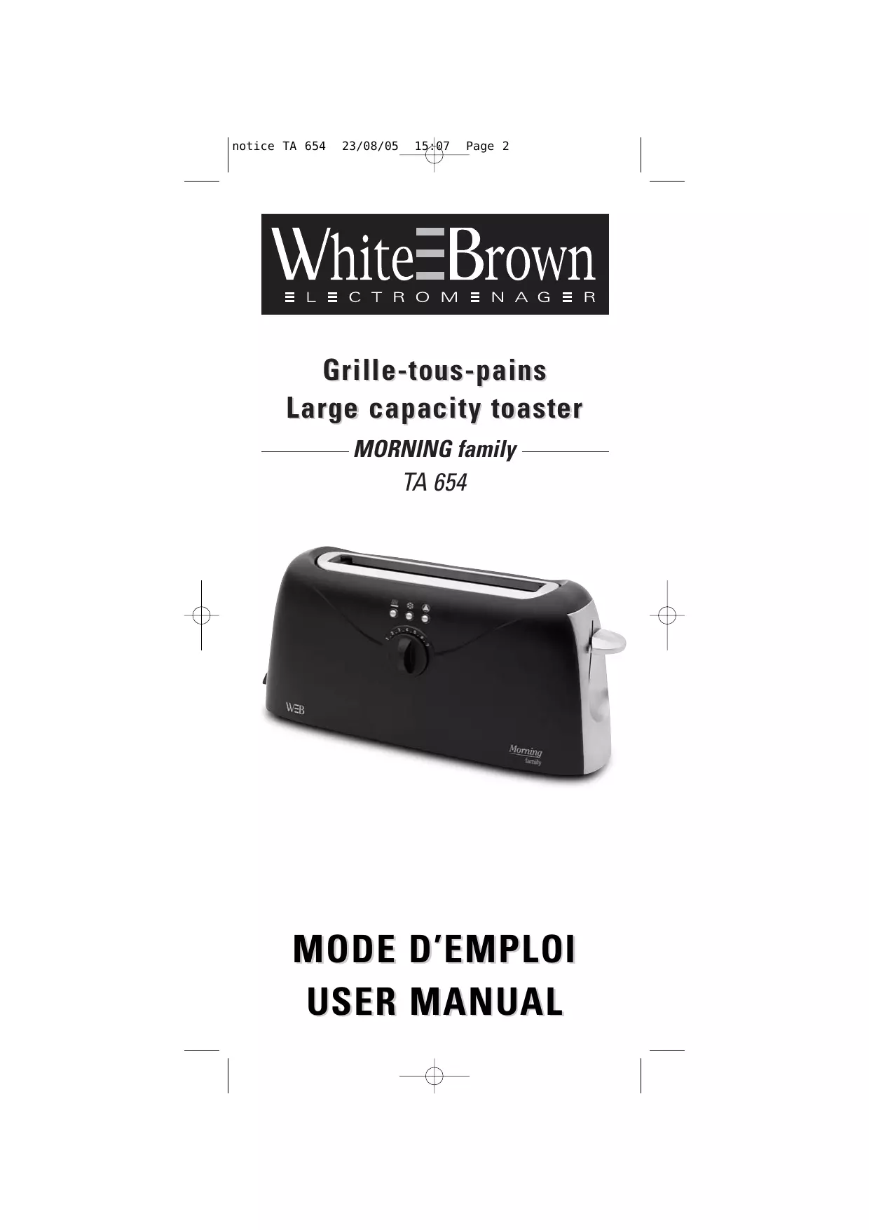 USER MANUAL notice TA 654 23/08/05 15:07 Page 3 FRANÇAIS WHITE & BROWN vous félicite d’avoir choisi ce produit et vous remercie de votre confiance. Pour votre confort et votre sécurité, votre article a été vérifié à toutes les étapes de sa fabrication et a passé avec succès tous nos tests de qualité. Nos produits sont conçus pour vous plaire tant par leur design que par leur facilité d’utilisation et dans l’objectif constant de vous apporter complète satisfaction.