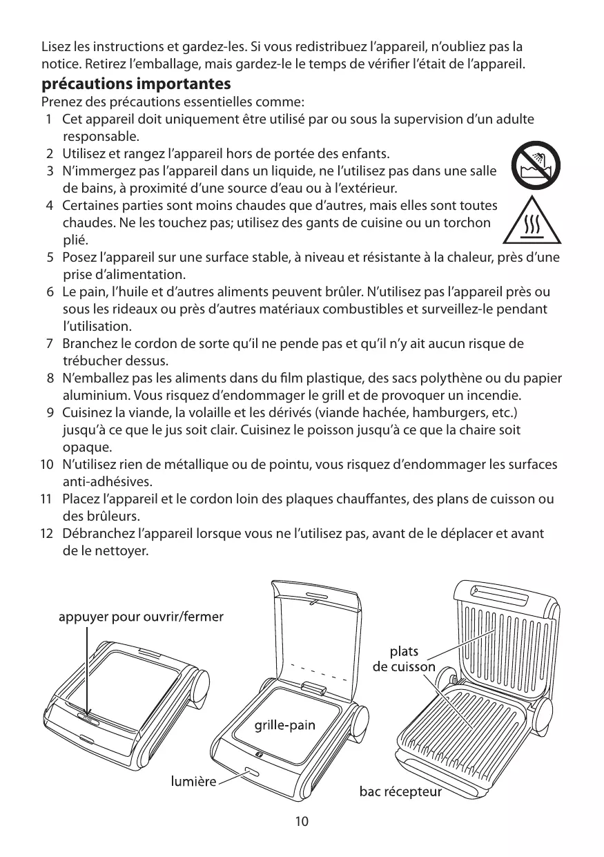 Lisez les instructions et gardez-les. Si vous redistribuez l’appareil, n’oubliez pas la notice. Retirez l’emballage, mais gardez-le le temps de vérifier l’était de l’appareil. précautions importantes Prenez des précautions essentielles comme: 1 Cet appareil doit uniquement être utilisé par ou sous la supervision d’un adulte responsable. 2 Utilisez et rangez l’appareil hors de portée des enfants. 3 N’immergez pas l’appareil dans un liquide, ne l’utilisez pas dans une salle de bains, à proximité d’une source d’eau ou à l’extérieur. 4 Certaines parties sont moins chaudes que d’autres, mais elles sont toutes chaudes. Ne les touchez pas; utilisez des gants de cuisine ou un torchon plié. 5 Posez l’appareil sur une surface stable, à niveau et résistante à la chaleur, près d’une prise d’alimentation. 6 Le pain, l’huile et d’autres aliments peuvent brûler. N’utilisez pas l’appareil près ou sous les rideaux ou près d’autres matériaux combustibles et surveillez-le pendant l’utilisation. 7 Branchez le cordon de sorte qu’il ne pende pas et qu’il n’y ait aucun risque de trébucher dessus. 8 N’emballez pas les aliments dans du film plastique, des sacs polythène ou du papier aluminium. Vous risquez d’endommager le grill et de provoquer un incendie. 9 Cuisinez la viande, la volaille et les dérivés (viande hachée, hamburgers, etc.) jusqu’à ce que le jus soit clair. Cuisinez le poisson jusqu’à ce que la chaire soit opaque. 10 N’utilisez rien de métallique ou de pointu, vous risquez d’endommager les surfaces anti-adhésives. 11 Placez l’appareil et le cordon loin des plaques chauffantes, des plans de cuisson ou des brûleurs. 12 Débranchez l’appareil lorsque vous ne l’utilisez pas, avant de le déplacer et avant de le nettoyer.
