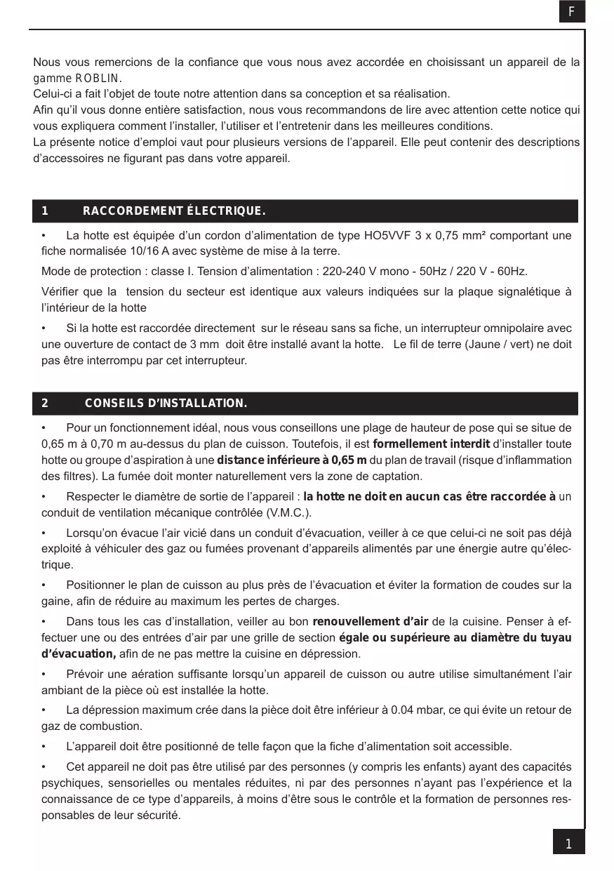 Nous vous remercions de la confiance que vous nous avez accordée en choisissant un appareil de la gamme ROBLIN. Celui-ci a fait l’objet de toute notre attention dans sa conception et sa réalisation. Afin qu’il vous donne entière satisfaction, nous vous recommandons de lire avec attention cette notice qui vous expliquera comment l’installer, l’utiliser et l’entretenir dans les meilleures conditions. La présente notice d’emploi vaut pour plusieurs versions de l’appareil. Elle peut contenir des descriptions d’accessoires ne figurant pas dans votre appareil.