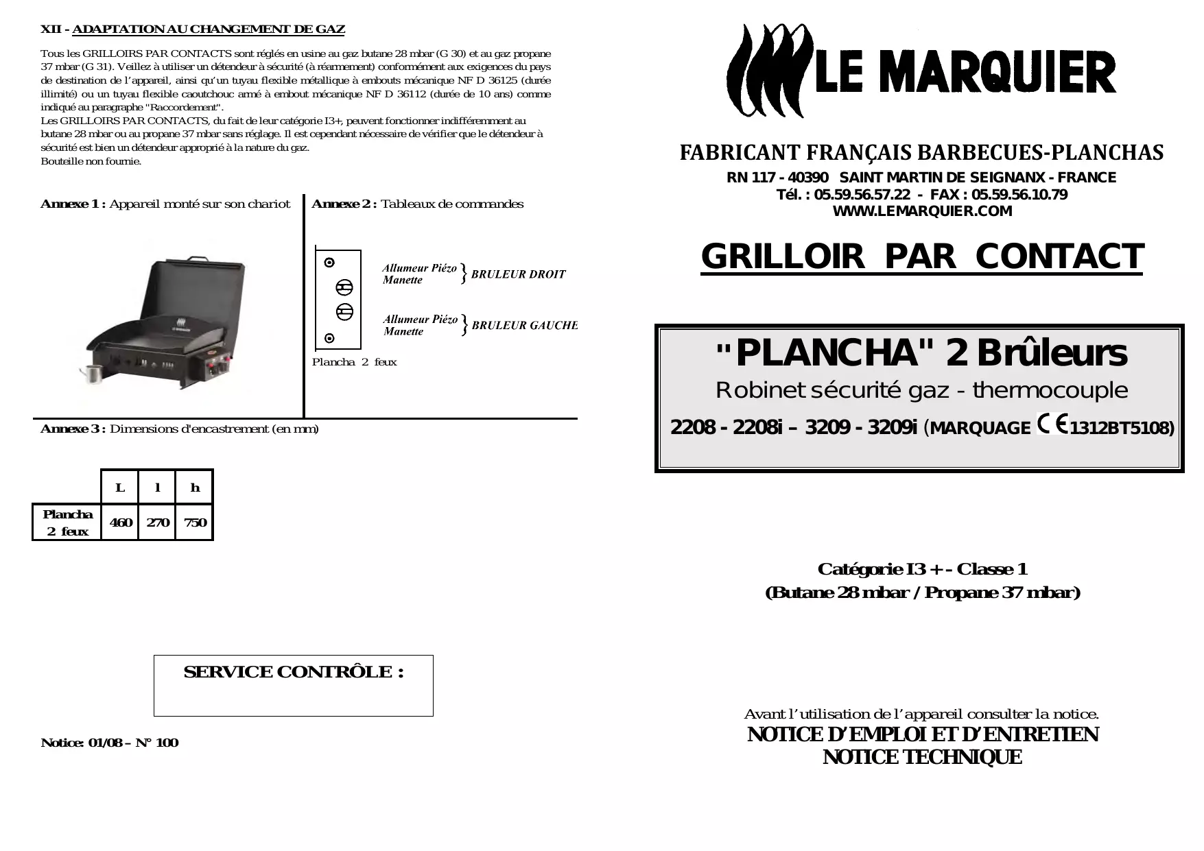 Les GRILLOIRS PAR CONTACTS, du fait de leur catégorie I3 + , peuvent fonctionner indifféremment au butane 28 mbar ou au propane 37 mbar sans réglage. Il est cependant nécessaire de vérifier que le détendeur a sécurité est bien un détendeur approprié à la nature du gaz.