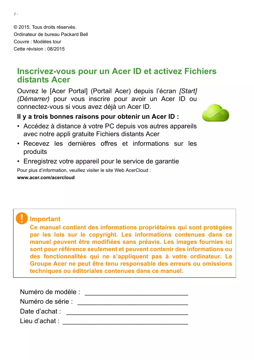 © 2015. Tous droits réservés. Ordinateur de bureau Packard Bell Couvre : Modèles tour Cette révision : 08/2015
