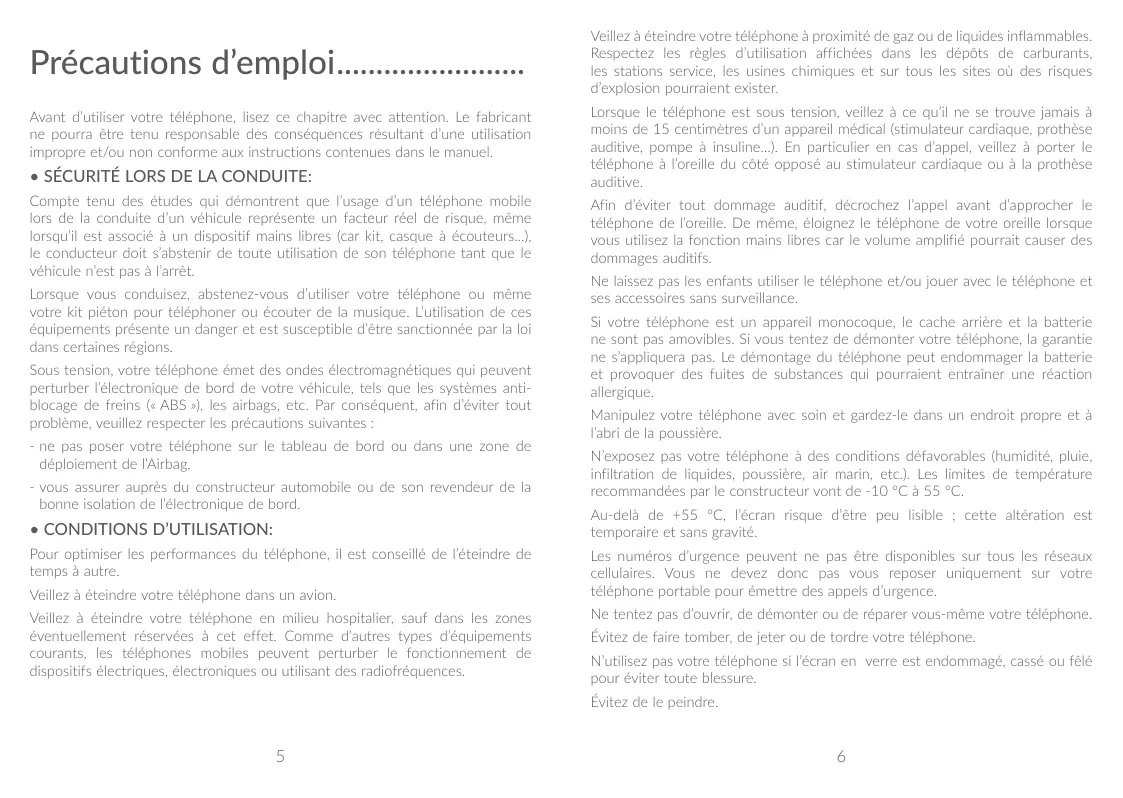 Précautions d’emploi Avant d’utiliser votre téléphone, lisez ce chapitre avec attention. Le fabricant ne pourra être tenu responsable des conséquences résultant d’une utilisation impropre et/ou non conforme aux instructions contenues dans le manuel.