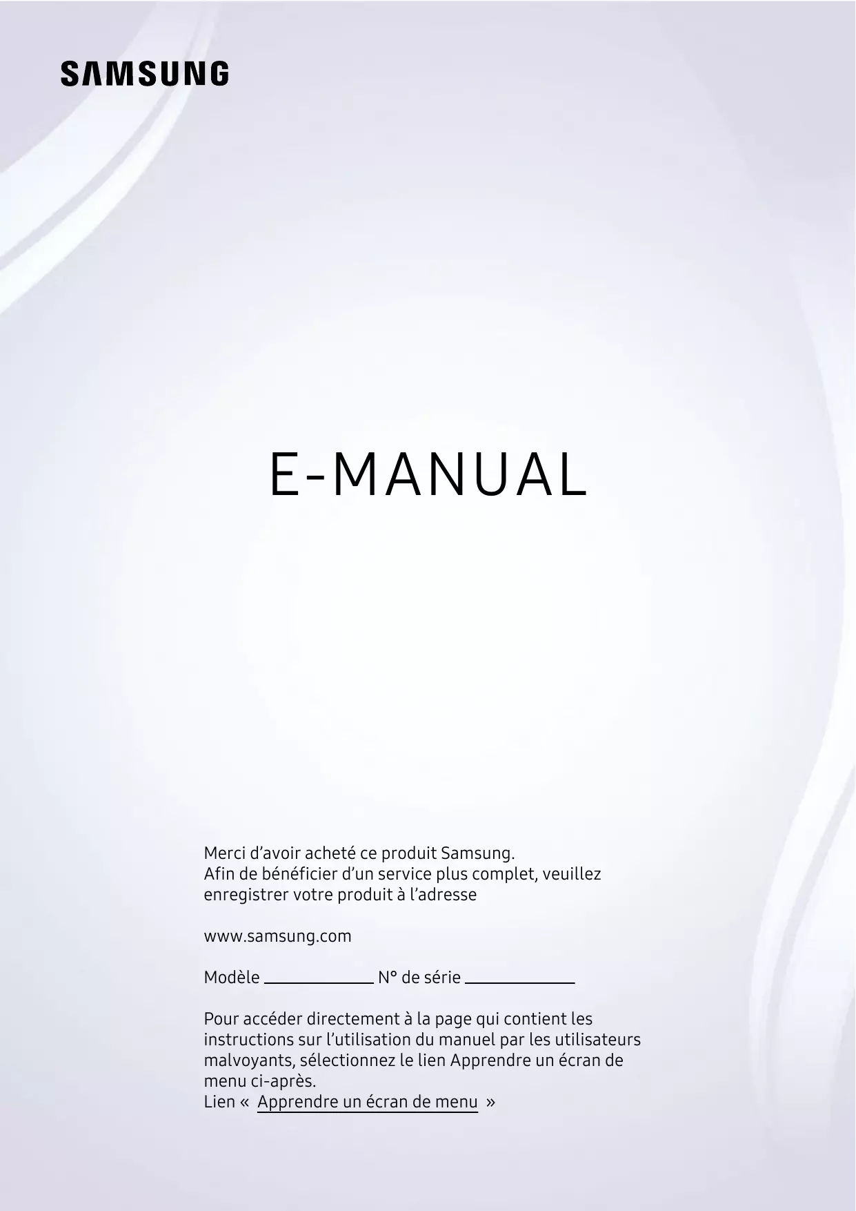 E-MANUAL Merci d’avoir acheté ce produit Samsung. Afin de bénéficier d’un service plus complet, veuillez enregistrer votre produit à l’adresse www.samsung.com Modèle N° de série Pour accéder directement à la page qui contient les instructions sur l’utilisation du manuel par les utilisateurs malvoyants, sélectionnez le lien Apprendre un écran de menu ci-après. Lien « Apprendre un écran de menu » Table des matières Guide