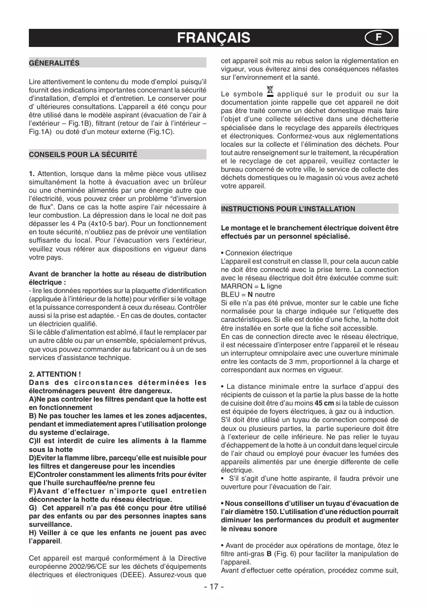 Dans des circonstances déterminées les électroménagers peuvent être dangereux. A)Ne pas controler les filtres pendant que la hotte est en fonctionnement B) Ne pas toucher les lames et les zones adjacentes, pendant et immediatement apres l’utilisation prolonge du systeme d’eclairage. C)Il est interdit de cuire les aliments à la flamme sous la hotte D)Eviter la flamme libre, parcequ’elle est nuisible pour les filtres et dangereuse pour les incendies E)Controler constamment les aliments frits pour éviter que l’huile surchauffée/ne prenne feu F)Avant d’effectuer n’impor te quel entretien déconnecter la hotte du réseau électrique. G) Cet appareil n’a pas été conçu pour être utilisé par des enfants ou par des personnes inaptes sans surveillance. H) Veiller à ce que les enfants ne jouent pas avec l’appareil. Cet appareil est marqué conformément à la Directive européenne 2002/96/CE sur les déchets d’équipements électriques et électroniques (DEEE). Assurez-vous que