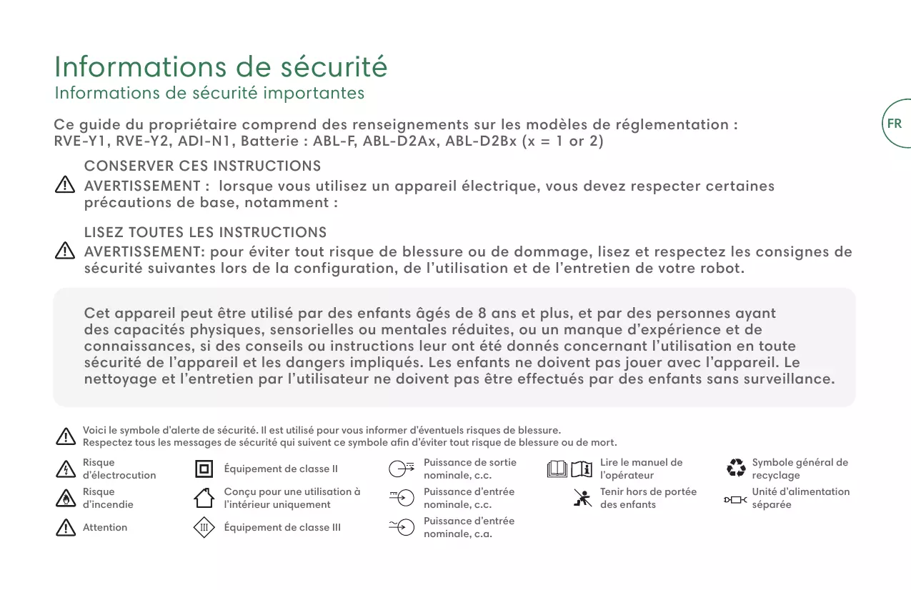 ull firmly on the wheel to remove it from P its housing (see illustration below). Remove any debris from inside the wheel cavity. FR Ce guide du propriétaire comprend des renseignements sur les modèles de réglementation : RVE-Y1, RVE-Y2, ADI-N1, Batterie : ABL-F, ABL-D2Ax, ABL-D2Bx (x = 1 or 2) CONSERVER CES INSTRUCTIONS AVERTISSEMENT : lorsque vous utilisez un appareil électrique, vous devez respecter certaines précautions de base, notamment : LISEZ TOUTES LES INSTRUCTIONS AVERTISSEMENT: pour éviter tout risque de blessure ou de dommage, lisez et respectez les consignes de sécurité suivantes lors de la configuration, de l’utilisation et de l’entretien de votre robot. Cet appareil peut être utilisé par des enfants âgés de 8 ans et plus, et par des personnes ayant des capacités physiques, sensorielles ou mentales réduites, ou un manque d’expérience et de connaissances, si des conseils ou instructions leur ont été donnés concernant l’utilisation en toute sécurité de l’appareil et les dangers impliqués. Les enfants ne doivent pas jouer avec l’appareil. Le nettoyage et l’entretien par l’utilisateur ne doivent pas être effectués par des enfants sans surveillance. Voici le symbole d’alerte de sécurité. Il est utilisé pour vous informer d’éventuels risques de blessure. Respectez tous les messages de sécurité qui suivent ce symbole afin d’éviter tout risque de blessure ou de mort. Risque d’électrocution