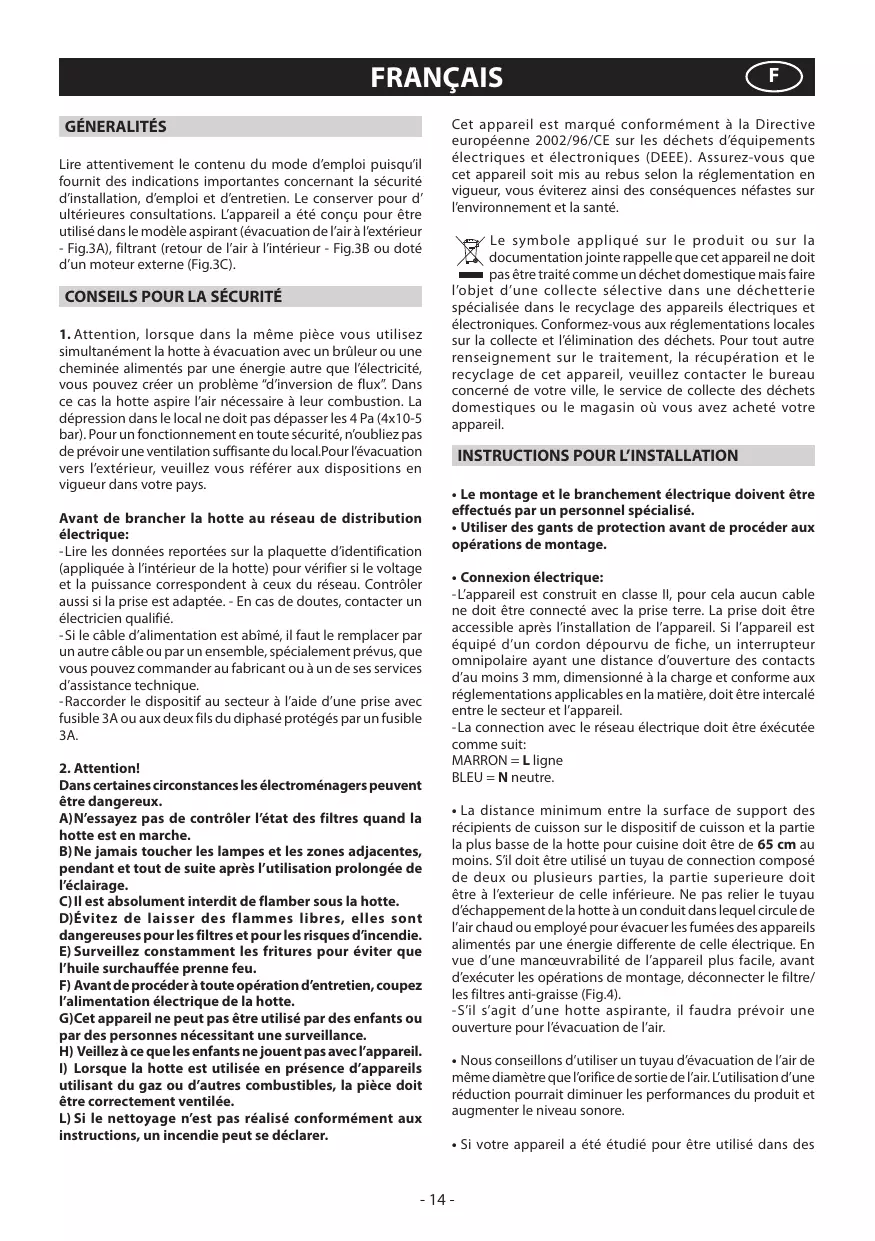 simultanément la hotte à évacuation avec un brûleur ou une cheminée alimentés par une énergie autre que l’électricité, vous pouvez créer un problème “d’inversion de flux”. Dans ce cas la hotte aspire l’air nécessaire à leur combustion. La dépression dans le local ne doit pas dépasser les 4 Pa (4x10-5 bar). Pour un fonctionnement en toute sécurité, n’oubliez pas de prévoir une ventilation suffisante du local.Pour l’évacuation vers l’extérieur, veuillez vous référer aux dispositions en vigueur dans votre pays. Avant de brancher la hotte au réseau de distribution électrique: - Lire les données reportées sur la plaquette d’identification (appliquée à l’intérieur de la hotte) pour vérifier si le voltage et la puissance correspondent à ceux du réseau. Contrôler aussi si la prise est adaptée. - En cas de doutes, contacter un électricien qualifié. - Si le câble d’alimentation est abîmé, il faut le remplacer par un autre câble ou par un ensemble, spécialement prévus, que vous pouvez commander au fabricant ou à un de ses services d’assistance technique. - Raccorder le dispositif au secteur à l’aide d’une prise avec fusible 3A ou aux deux fils du diphasé protégés par un fusible 3A.